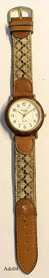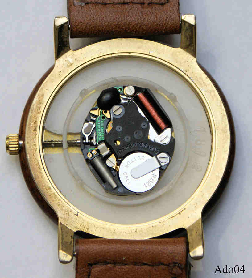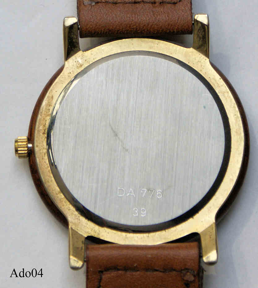 A woodwatch from Adora. Signed front: ”ADORA, freeline, Quartz”, inside: ”Euromovement, No 0 Jewels, Unadjusted”, back: ”DA776, 39”