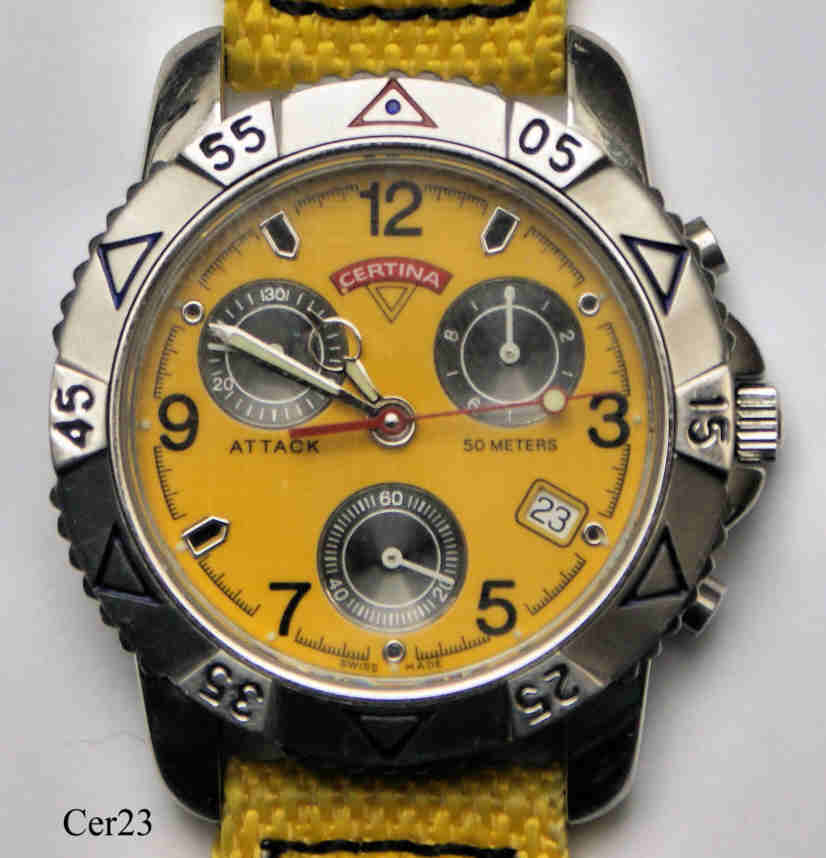 Dies ist ein Certina Attack Quartz Chronograph, beschriftet: ”Certina, Attack, 50 Meters, Swiss Made”, innen: ”Twentytwo 22 Jewels, 251.272, Swiss”, hinten: ”542 1092 1192 42, All Stainless Steel, Water Resistant 50 Meters, Sapphire Chrystal”. Gehäuse Edelstahl, geschraubter Boden, Kaliber ESA 252.272. Diese Uhr wurde beim großen Preis von Monaco 1988 verkauft