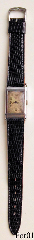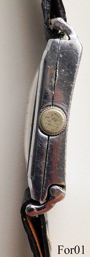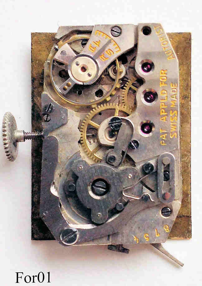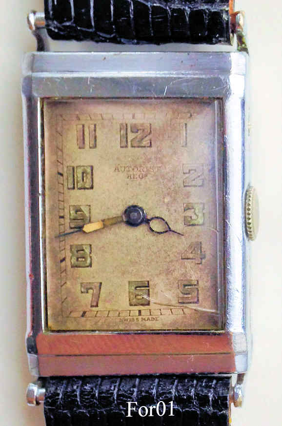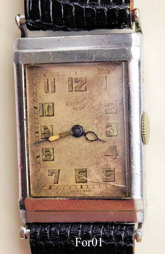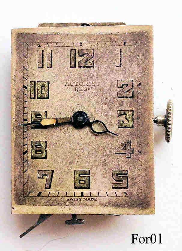 Diese Autorist Automatic Uhr ist eine weitere Armbanduhr mit automatischem Aufzug, entwickelt von John Harwood , produziert bei Fortis um 1933 in der Schweiz. Das Automatic Werk ist eine uhrmacherische Rarität, der Aufzug erfolgt über einen Armbandbügel, der in das T-Stück bei der 6 einklinkt, durch die Bewegung der Uhr auf dem Handgelenk. Bezeichnet vorn: “Autorist, RegP, Swiss Made”, innen: “Pat. Appld for, Swiss Made, Autorist, 8754”. Das Gehäuse wird über ein Scharnier auf der linken Seite aufgeklappt. Masse: 32 x 23 mm.