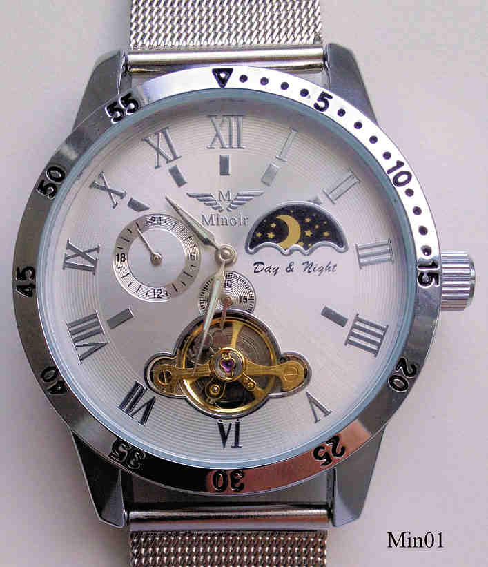 Diese Automatic Uhr von Minoir, Modell Avignon, hat einen Glasboden, ein Automatic Werk und ein interessantes Zifferblatt. Es gibt eine Anzeige für Tag/Nacht, eine Anzeige für GMT sowie eine Sekundenanzeige und die offene Unruhe. Großes Edelstahl Gehäuse. Beschriftung vorn: ”Minoir, Day & Night”, hinten: ”3ATM Water Resistant, Automatic, Avignon, Minoir”. Milanaise Armband