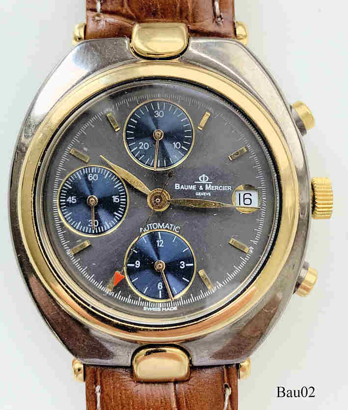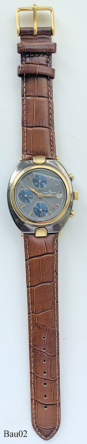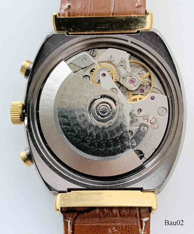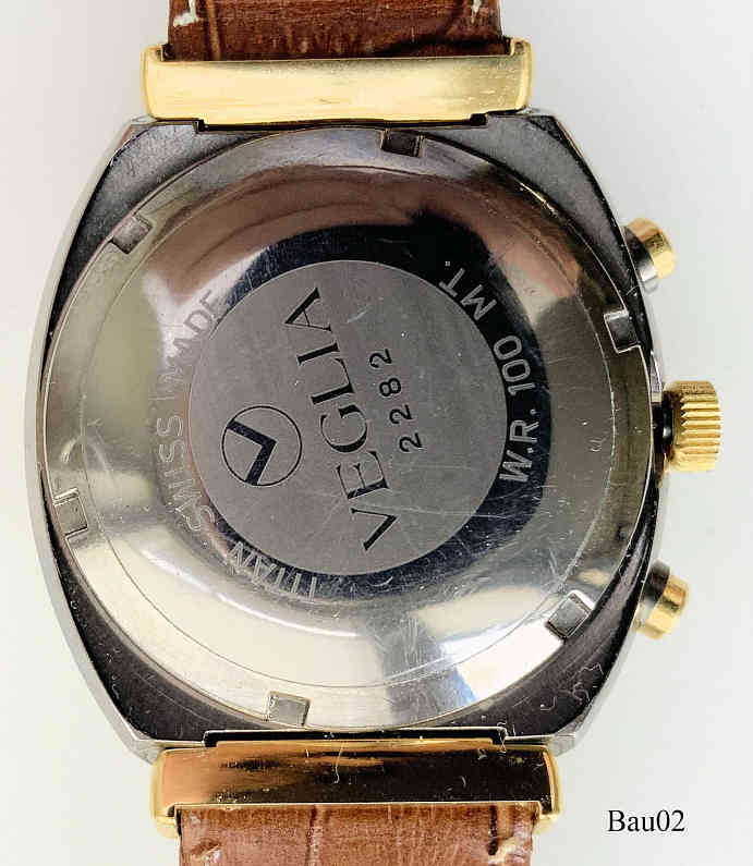 Dies ist eine Baume&Mercier Veglia 2282, Valjoux 7750, Referenz Nr.: 2822, schweres Titan Gehäuse, stainless steel back, Datum bei der 3. Bezeichnung auf dem Zifferblatt: ”Baume&Mercier, Geneve, Automatic, Swiss Made”, In der Rückwand: ”Veglia 2282, Titan Swiss Made, WR100 MT”€, innen: ”25 Jewels, Twenty Five, Swiss, 7750”€