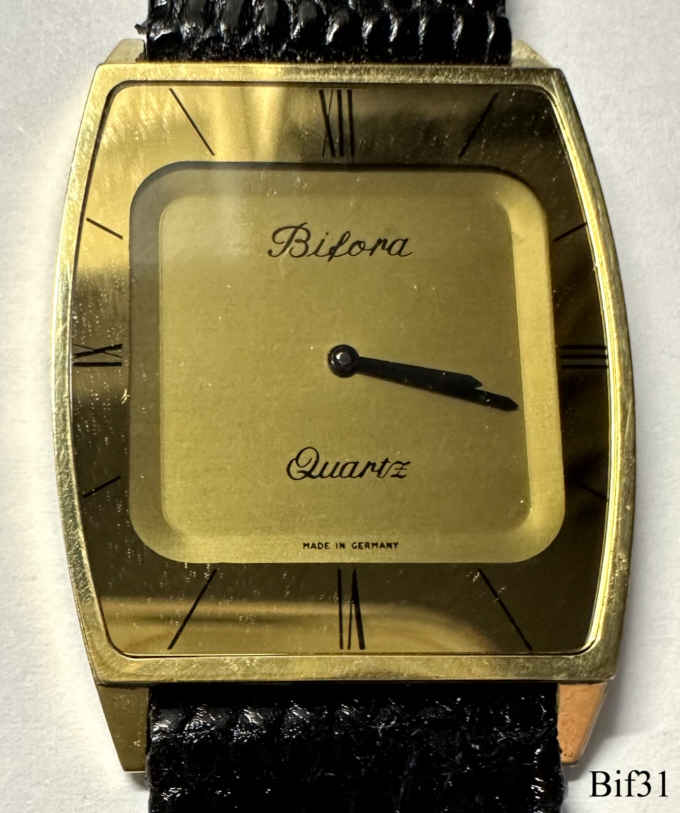 Dies ist eine Bifora Quartz Uhr mit dem Slim Line Werk B17, der Stellknopf ist an der Rückseite. Die Uhr hat ein sehr ansprechendes vergoldetes Gehäuse und ist  3,2mm dick. Beschriftet vorn: ”BIFORA, Quartz, Made in Germany”, hinten: ”Bifora, Made in W. Germany, Stainless Steel Back, Base Metal Gold Plated”, innen: “B, Two 2 Jewels, Unadjusted, W. Germany”.  Kaliber: Bifora B17.