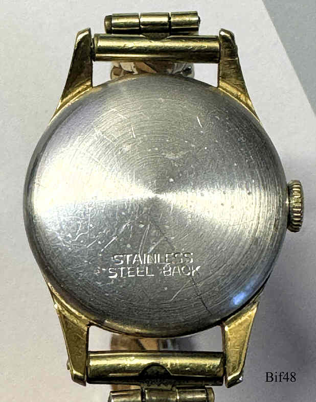 Dies ist eine Bifora Handaufzugs Uhr mit dem Bifora 934 Werk, an den Zeitgeschmack angepasst durch eine Zentral Sekunde. Dafür wurde die Kaliber Bezeichnung durch ein SC modifiziert. Beschriftet vorn: ”¯BIFORA, Top, Shockproof”, hinten: ”Stainless Steel Back”, innen: ”¯B, 934 SC”,¯ Kaliber: Bifora 934 SC, 1-61 Elasta-Luxus Armband