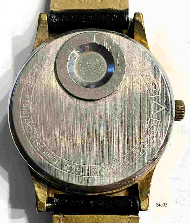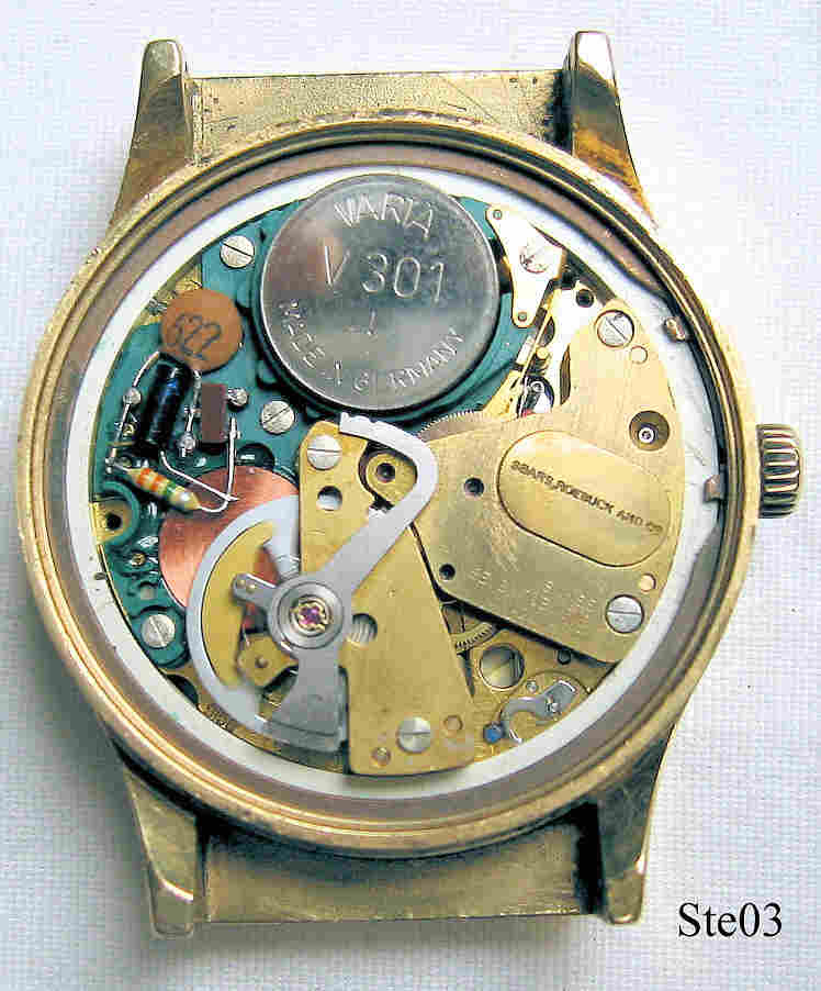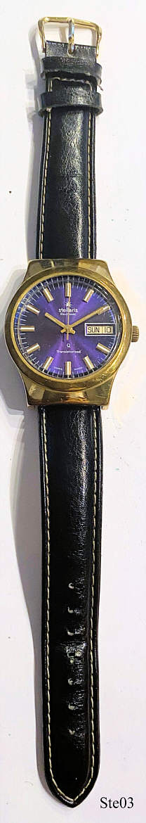 Eine Stellaris Electronic Uhr. Stellaris ist wohl die Eigenmarke der Kaufhauskette Sears, Roebuck & Co. Base Metal Gehäuse mit Edelstahl Boden. Das Uhrwerk ist ein Swissonic Werk, Kaliber 9158. Beschriftet vorn: “Stellaris, Electronic, Transistorized”, hinten: ”Water Resistant, Base Metal Bezel, Stainless Steel Back, Swiss”, innen: “Swiss, Seven Jewels, Unadjusted, Sears, Roebuck and Co”, Day / Date bei der 3.