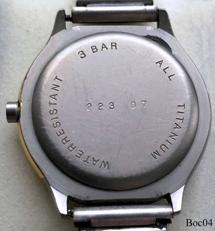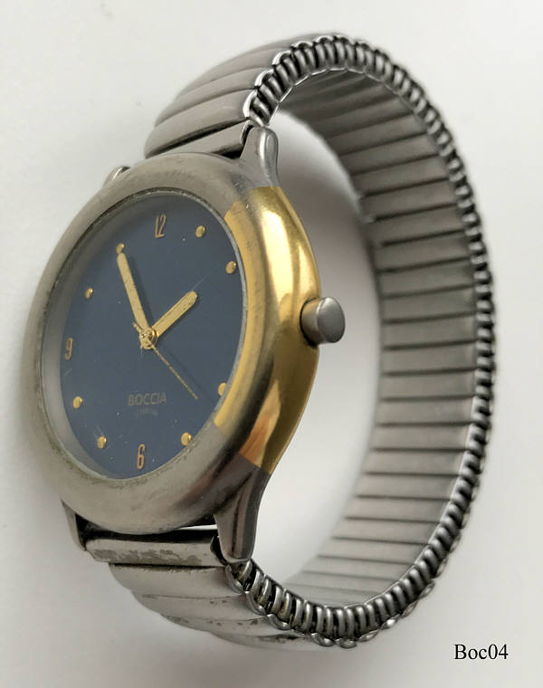 Eine Boccia Herrenuhr mit Titan Gehäuse, wobei ein Viertel vergoldet ist, dunkel blauem Zifferblatt und goldfarbenen Zeigern. Beschriftet vorn: “Boccia, Titanium”, hinten: ”All Titanium, Water Resistant 3 Bar, 223 07”, innen: “One 1 Jewel, ETA 902.105, Swiss Parts, Thailand Movement”, FixoFlex Armband. Kaliber ETA 902.105