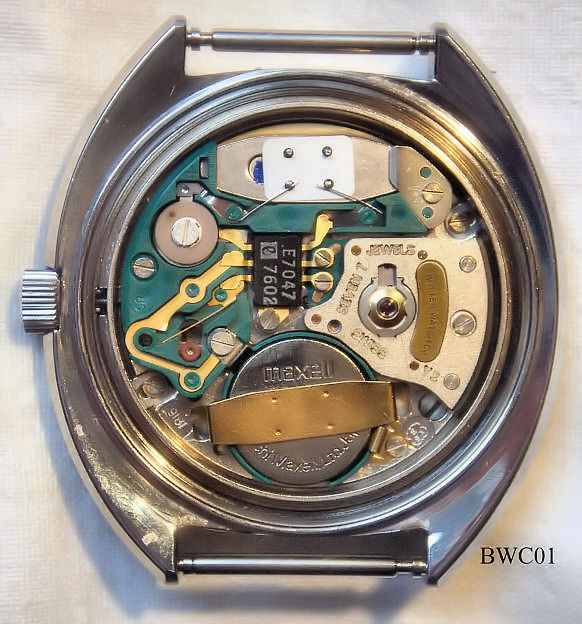 Eine BWC Trensi-Tronic Quartzuhr. Edelstahl Gehäuse, Tag und Datum bei der 3. Aufschrift vorn: “BWC,Swiss, Trensi-Tronic, Quartz”, innen: ”Buttes Watch Co, seven 7 Jewels, V2, ETA 9181”, hinten: ”Quartz, Electronic, Stainless Steel, Swiss Made, 663001”. Caliber ETA 9181