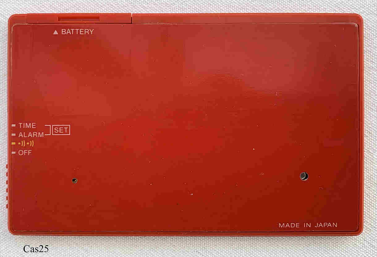 Eine Digitaluhr von Casio mit Wecker in der Form einer Scheckkarte. Kunststoff Gehäuse 3mm dick. Beschriftet vorn: ”Card Clock, Casio, Quartz Alarm CC-100.”, hinten: ”Made in Japan”.