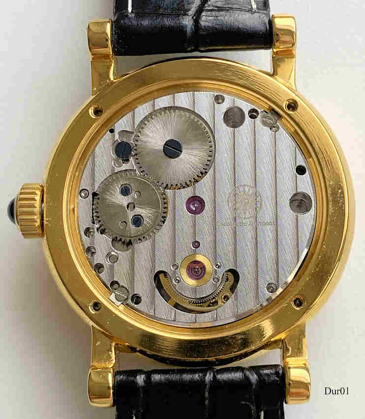 Eine Handaufzugsuhr mit “Flying Minute Tourbillon” der Marke Constantin Durmont mit China Werk Cal. 5051 der Liaoning Factory. Schwarzes Zifferblatt mit Power Reserve Anzeige. Das Tourbillon ist eine Erfindung von Abraham Louis Breguet, als Flying Minute Tourbillon verfeinert vom Uhrmacher-Lehrer Alfred Helwig. Vergoldetes Edelstahl Gehäuse mit verschraubtem Glasboden und schwarzem Lederarmband. Beschriftung vorn: “Constantin Durmont, Tourbillon”, hinten: “Constantin Durmont, 3 ATM Water Resistant, Saphire Chrystal, Stainless Steel”, innen: “Constantin Durmont, Logo”.