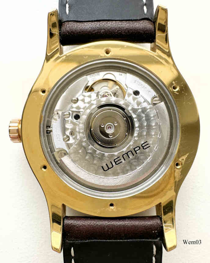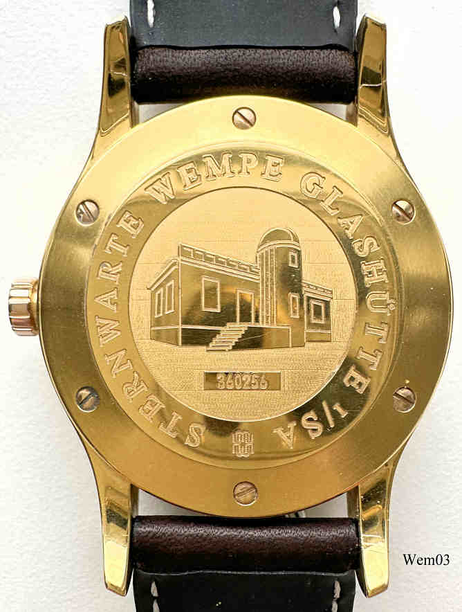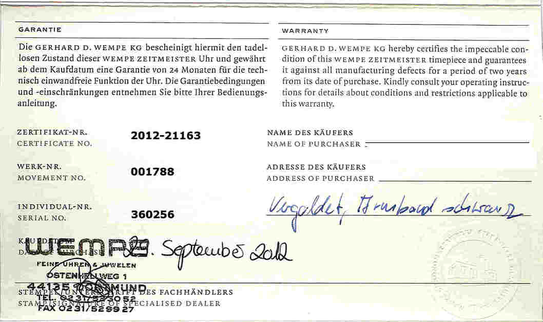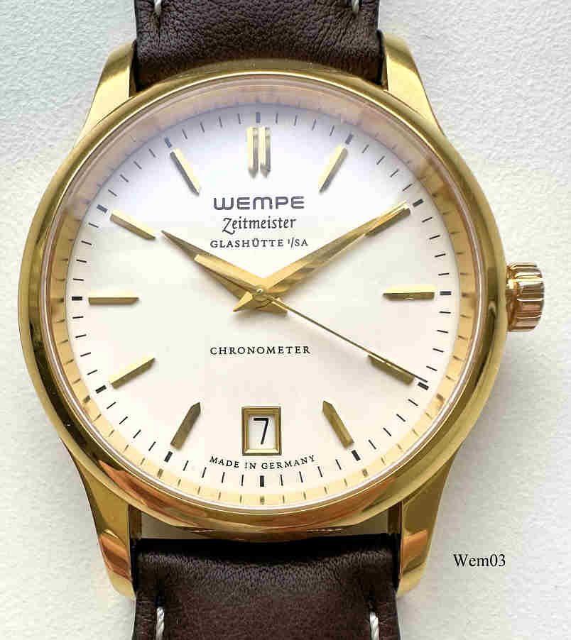 Dies ist ein Herren Automatic Chronometer “Zeitmeister” der Firma Juwelier und Uhrmacher Wempe in Hamburg / Glashütte. Weißes Zifferblatt mit Datum bei der 6. Beschriftet vorn: “Wempe, Zeitmeister, Glashütte i/SA (in Sachsen), Chronometer, Made in Germany”, hinten: ”Sternwarte Wempe, Glashütte i/SA, 360256”, innen :”2892 A2, V8ZK1, Twentyone 21 Jewels, Swiss, 001788, Wempe,”, im Boden: “036-1023, Sip. 59”. Caliber ETA 2892 A2 ,Braunes Lederarmbandsowie mit dem “Full Set”, inklusive Chronometer Zertifikat der Sternwarte Glashütte.