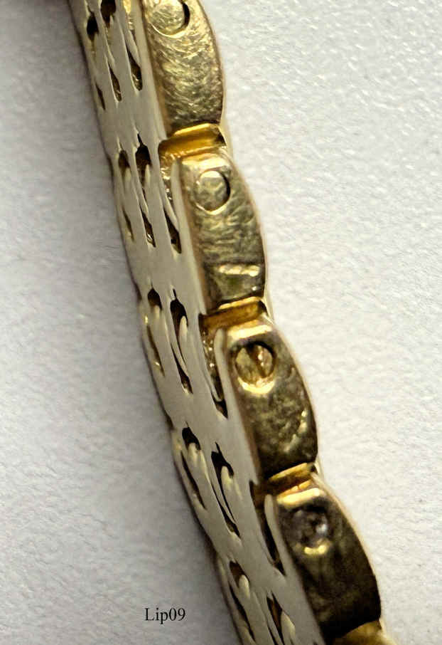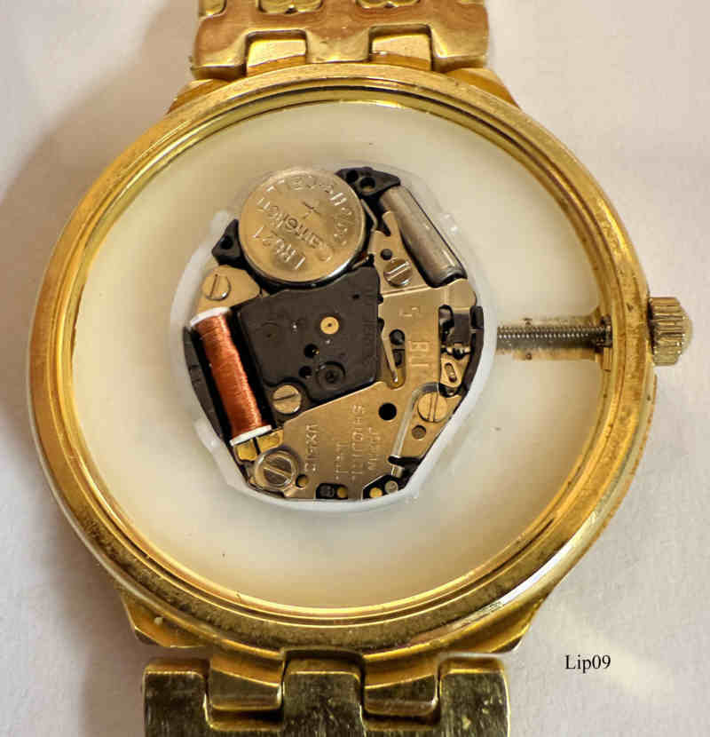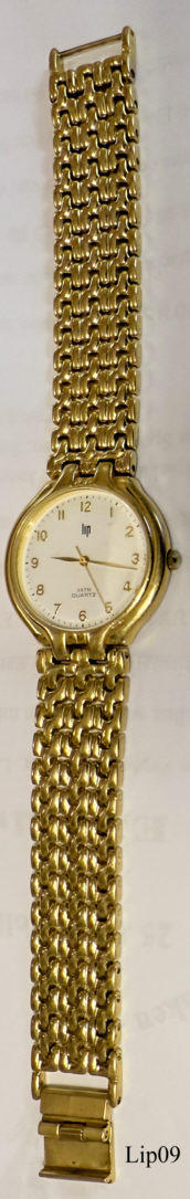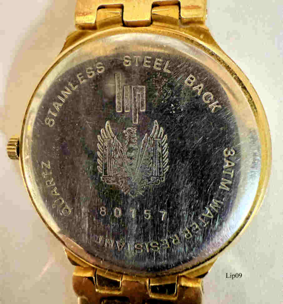 Dies ist eine Damen Quartz Armbanduhr from Lip, mit einem interessanten integrierten Metall Gliederarmband. Beschriftet vorn: ”Lip, 3 ATM, Quartz”, hinten: “Stainless Steel Back, 3 ATM Water Resistant, 80157”, innen: ”Japan, Shiojiri Ltd., UX51C”. Die Bandglieder sind von beiden Seiten zur Mitte hin verschraubt