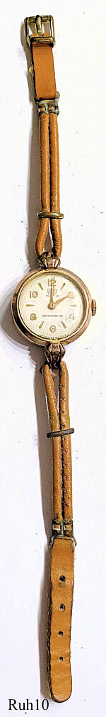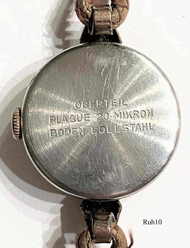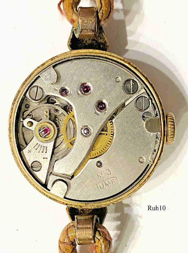 Eine Ruhla Handaufzugs Damenuhr mit vergoldetem Gehäuse und Stainless Steel Back, eine Uhr aus der Ruhla UMF Manufaktur. Beschriftung vorn: “UMF, Ruhla, 15 Rubies, Antimagnetic”, hinten: “Oberteil, Plaque 20 Micro, Boden Edelstahl”, innen: “M3, UMF ”. Uhrwerk UMF M3, Braunes Leder Band