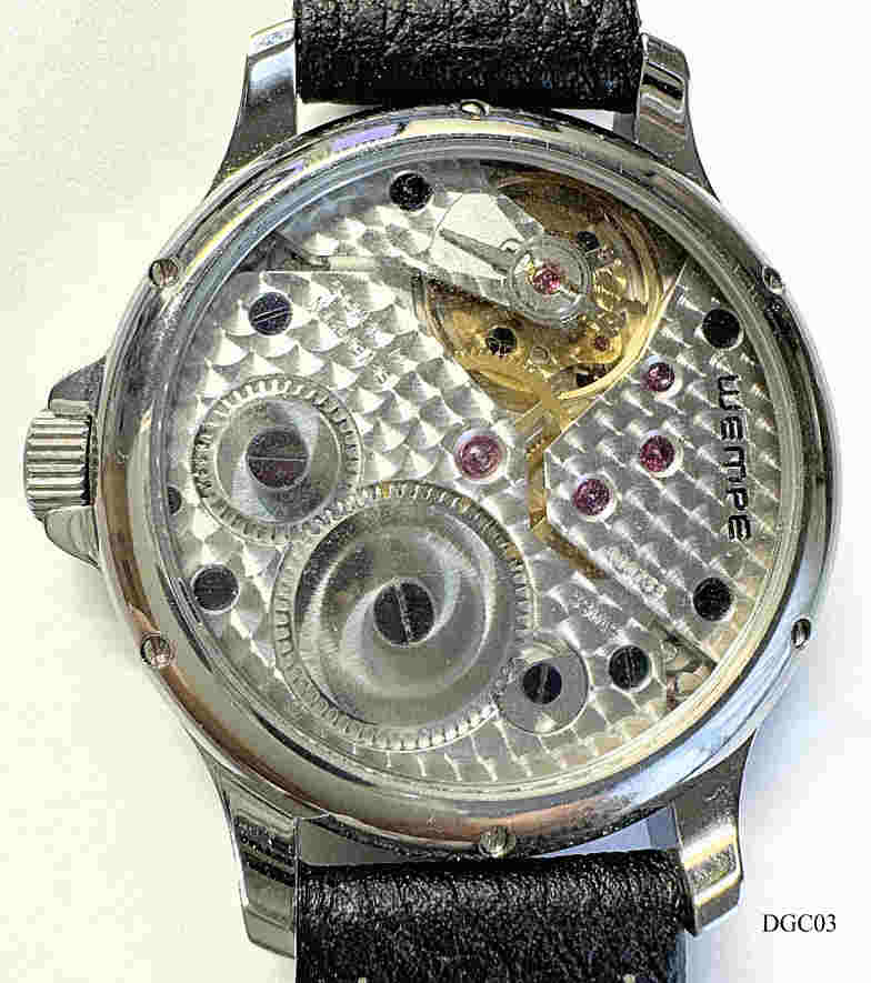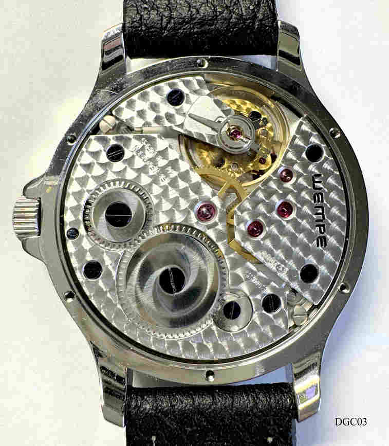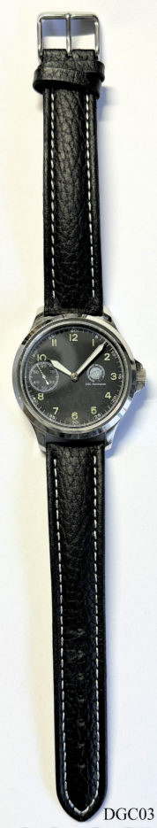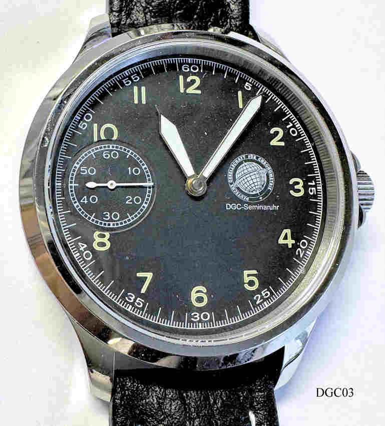 Diese Uhr wird im DGC Armbanduhren Seminar 1 & 2 zusammen gebaut, eingestellt und reguliert. Anschließend wird im Veredelungs Seminar 5 die Ankerplatte perliert und vergoldet, die Schraubenpoliert und gebläut und das Sperr- und Kronrad mit einem Sonnenschliff versehen. Später wird im Chronometer Seminar bei der Firma WEMPE eine Schwanenhals Regulierung eingebaut und die Uhr auf Chronometer Gangwerte bearbeitet. Beschriftet vorn: “DGC Seminaruhr”, innen: “WEMPE, Seventeen Jewels, Swiss, 000733, ETA 6497”. Schwarzes Lederarmband.
