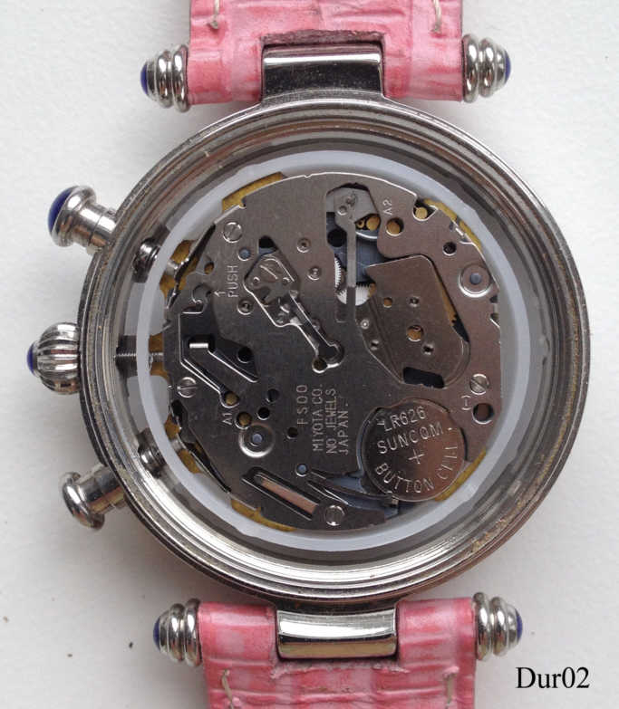 A Constantin Durmond Quartz chronograph as ladies dresswatch. Calendar at 12, mother of pearl dial with diamond points as numbers. Movement Miyota Caliber FS00. Signed front: “Constantin Durmond Diamond”, back: “Stainless Steel, Chronograph Movement, 3 ATM Water Resistant, Constantin Dumond, Visage Sports, Ref: 1922, Serial: 2526”, inside: “FS00, Miyota Co., No Jewels, Japan”. Rose Leather band.