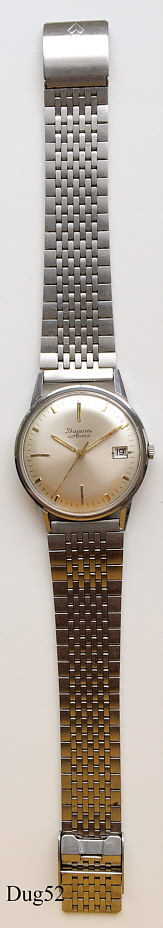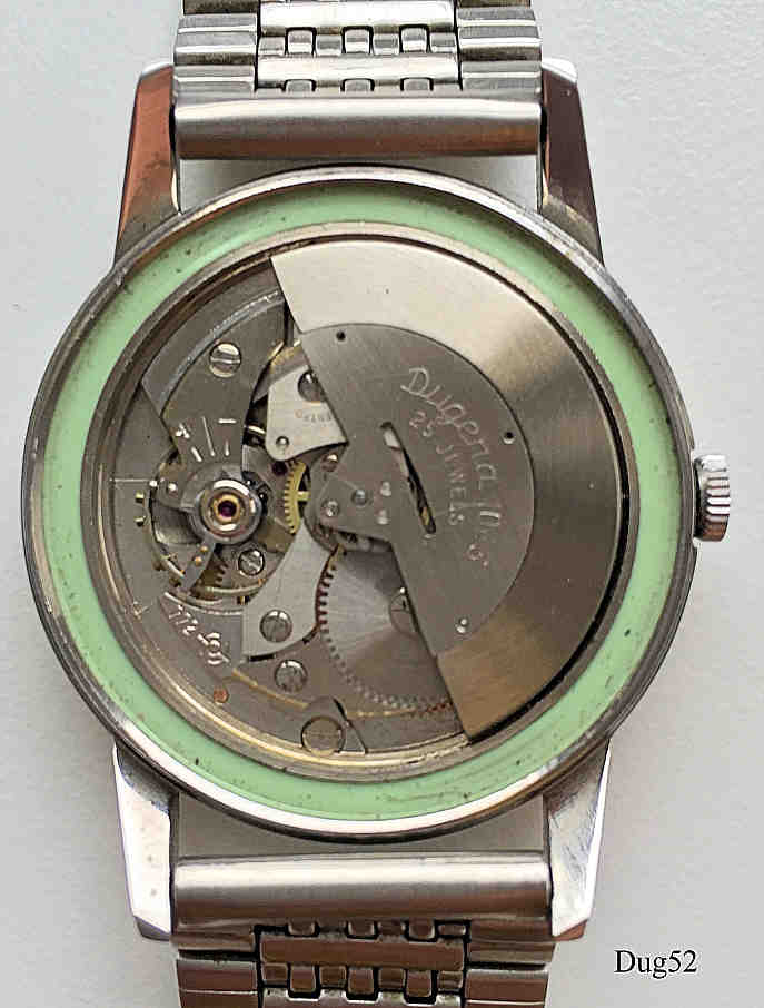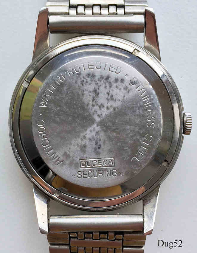 Dies ist eine Dugena Automatic Uhr. Sie hat ein normales Automaticwerk mit Datum bei der 3. Beschriftet vorn: ”Dugena, Automatic”, hinten: “Antichoc, Water Protected, Stainless Steel, Dugena, Securing”, innen: “Dugena 1043, 25 Jewels, 722”, Kaliber Otero 772. Edelstahl Gliederband.