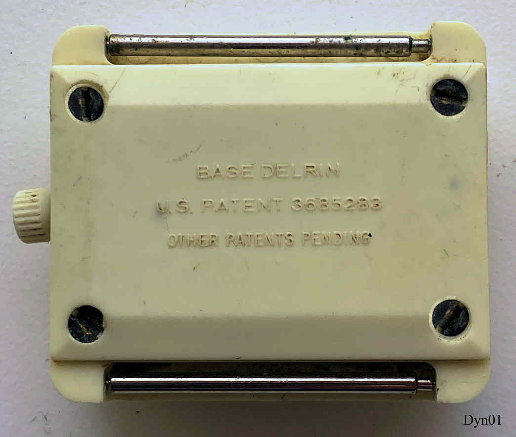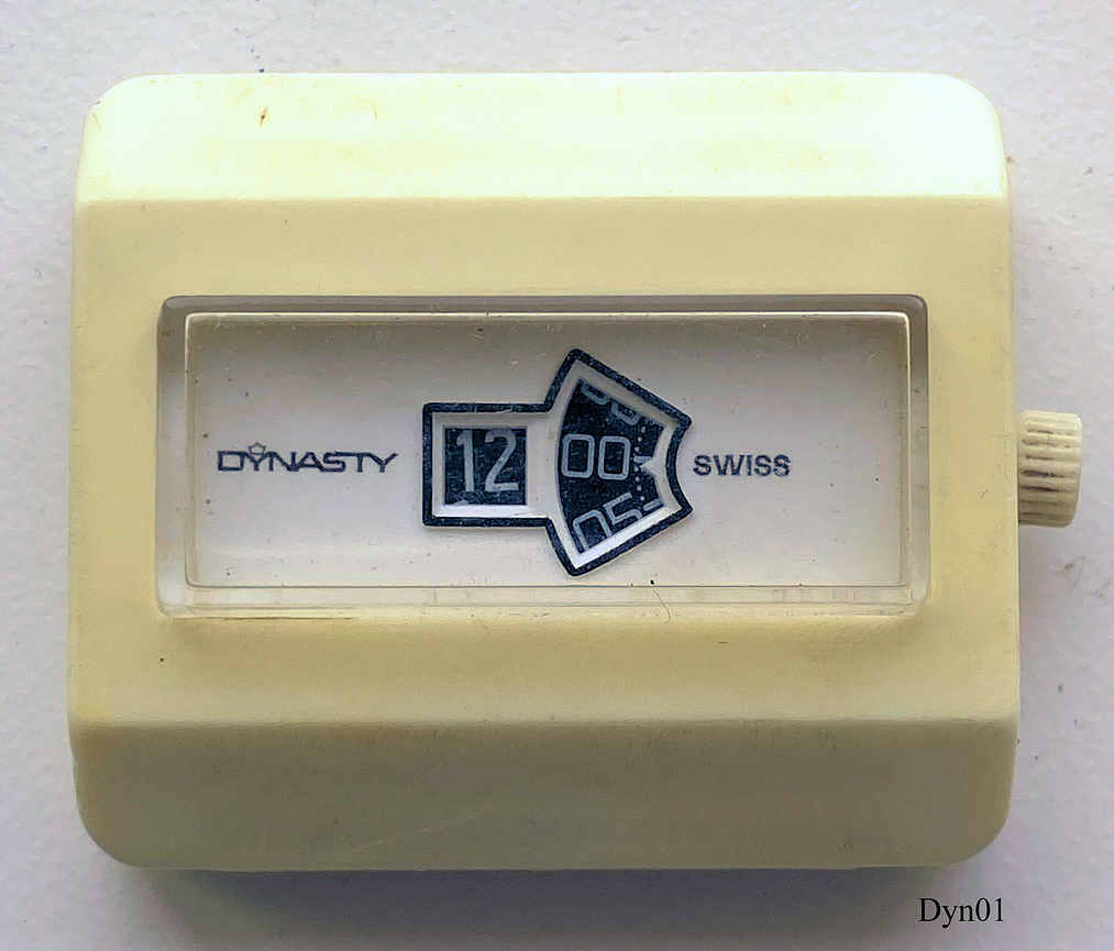 A Dynasty Digital watch with handwind jump-hour Caliber Amida 420, instead of hands two discs, hour- and minute-disc turn around. The time is then read out in a window on the dial. The case is made from the new meterial Delrin, an Acetal-Homopolymer from Dupont. Signed front: ”Dynasty, Swiss”, back: “Base Delrin, U.S.Patent 3685288, Other Patents pending”. |