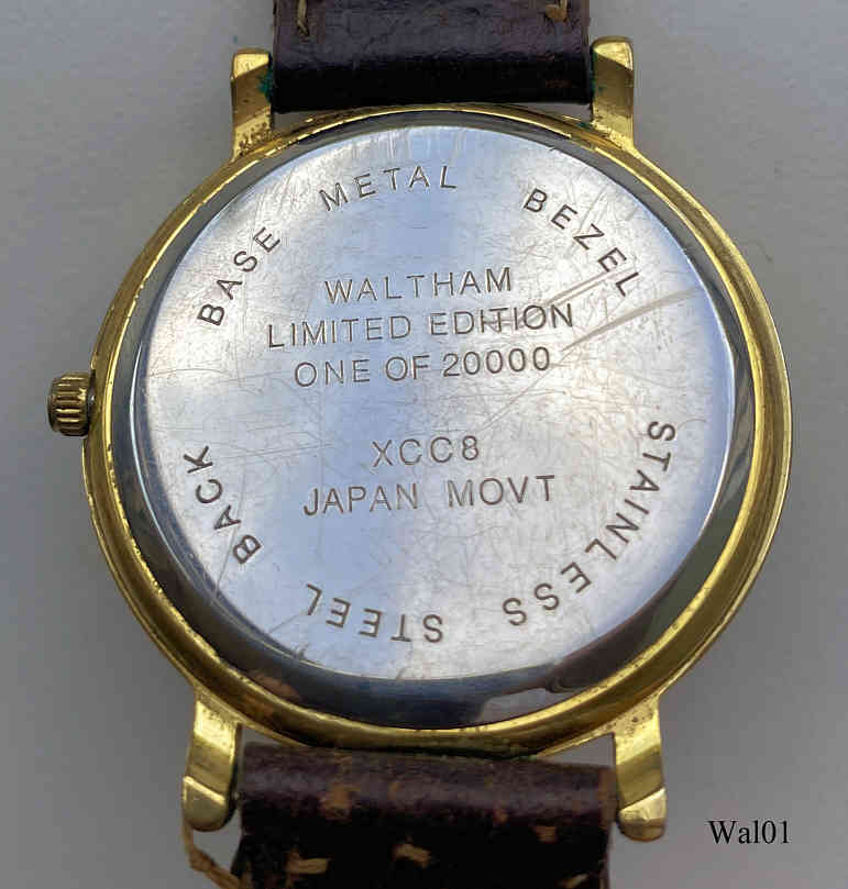 Diese Waltham Uhr verwendet ein billiges Miyota Quartz Uhrwerk. Die Uhr hat eine gepresste Rückwand und lebt durch das besondere Zifferblatt, eine Nachbildung eines amerikanischen Half Dollars. Beschriftung vorn: “United States of America, E Pluribus Unum, Half Dollar”, back: ”Base Metal Bezel, Stainless Steel Back, Waltham, Limited Edition, One of 20000, XCC8, Japan Mvmt”, innen: “One 1 Jewel, Unadjusted, Miyota Co., Japan”.