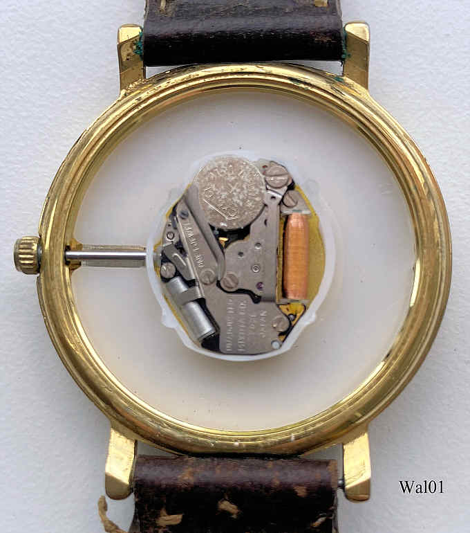 Diese Waltham Uhr verwendet ein billiges Miyota Quartz Uhrwerk. Die Uhr hat eine gepresste Rückwand und lebt durch das besondere Zifferblatt, eine Nachbildung eines amerikanischen Half Dollars. Beschriftung vorn: “United States of America, E Pluribus Unum, Half Dollar”, back: ”Base Metal Bezel, Stainless Steel Back, Waltham, Limited Edition, One of 20000, XCC8, Japan Mvmt”, innen: “One 1 Jewel, Unadjusted, Miyota Co., Japan”.