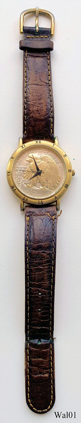 Diese Waltham Uhr verwendet ein billiges Miyota Quartz Uhrwerk. Die Uhr hat eine gepresste Rückwand und lebt durch das besondere Zifferblatt, eine Nachbildung eines amerikanischen Half Dollars. Beschriftung vorn: “United States of America, E Pluribus Unum, Half Dollar”, back: ”Base Metal Bezel, Stainless Steel Back, Waltham, Limited Edition, One of 20000, XCC8, Japan Mvmt”, innen: “One 1 Jewel, Unadjusted, Miyota Co., Japan”.