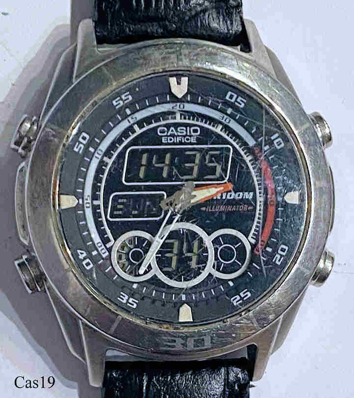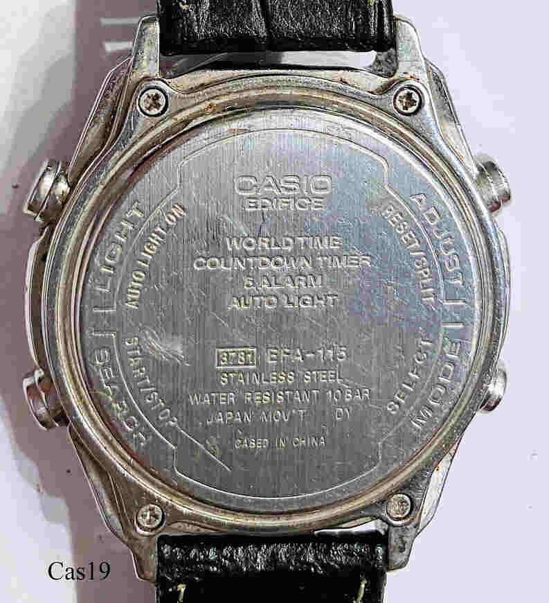 Ein moderner Ana-Digi Chronograph von Casio. Base Metal Gehäuse, Zeitanzeige oben, Sekunden unten, Wochentag bei der 9. Beschriftet vorn: ”Casio, Edifice, WR100M, Illuminator”, innen: ”Up(+), Casio, Japan, AC, (-)”, hinten: ”Casio, Edifice, World Time, Countdown Timer, 5 Alarm, Auto Light, 3181 EFA_115, Stainless Steel, Water Resistant 10 Bar, Japan Mov’t DY, Cased in China”.