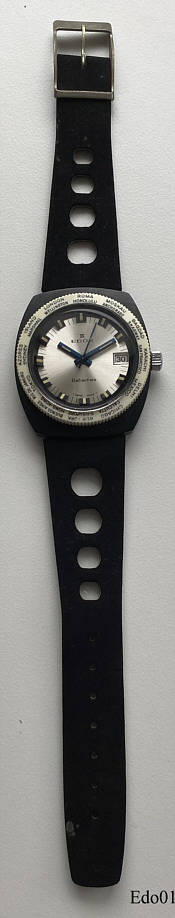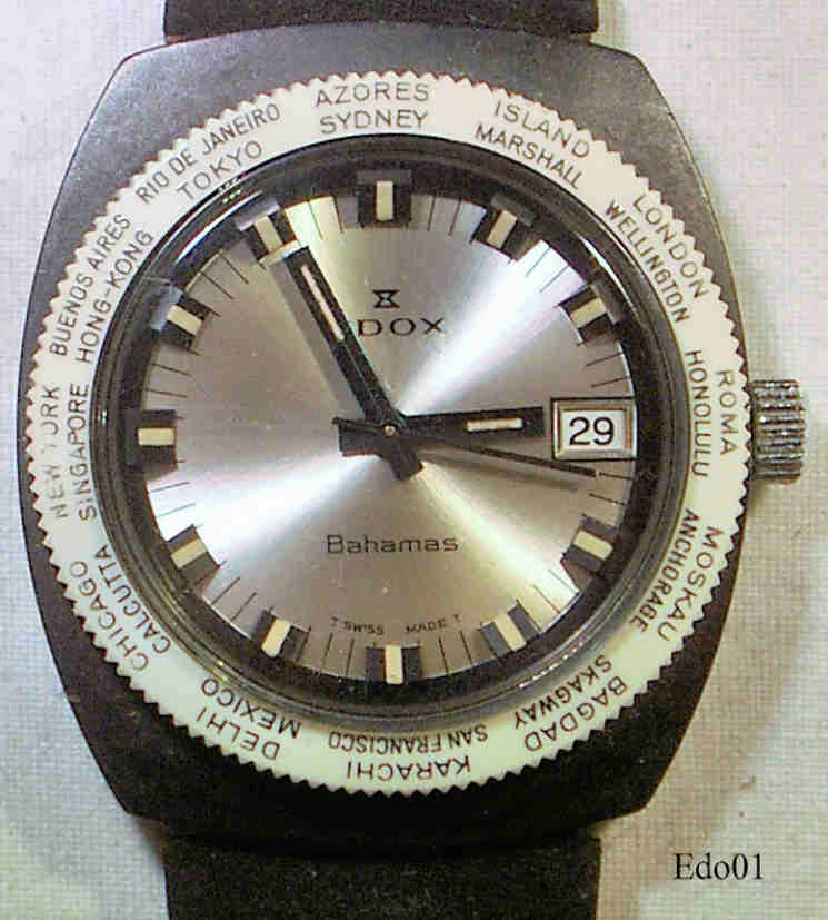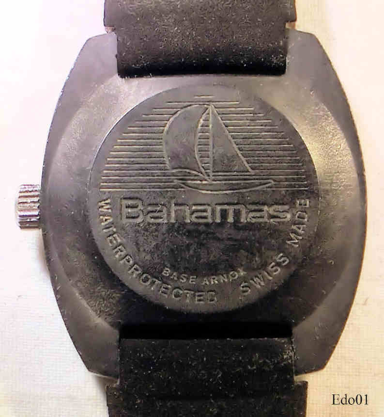 Eine Edox Bahamas Uhr mit Handaufzugs Werk. Einfaches, silbernes Zifferblatt mit weißer Drehlunette, Kalender bei der 3, Arnox Kunststoff Gehäuse. Beschriftet vorn: “Edox, Bahamas, Swiss Made”, hinten: ” Bahamas, Base Arnox, Water Protected, Swiss Made ”, Geschlossenes Gehäuse, öffnen der Uhr vom Glas her.