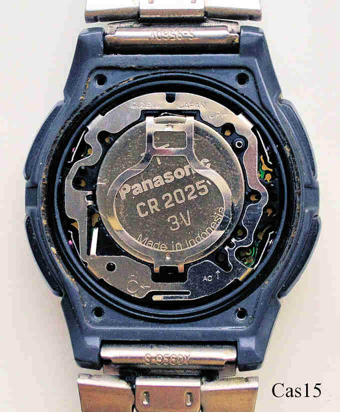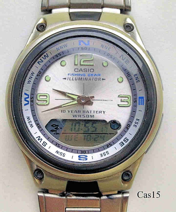 Ein moderner Ana-Digi Chronograph von Casio mit Angler und Mondphasen Funktionen. Kuststoff Gehäuse mit silbernem Kompaßring und Stahl-Gliederarmband. Beschriftet vorn: ”Casio, Fishing Gear, Illuminator, 10 Year Battery, WR 50m”, innen: ”Casio, Japan”, hinten: ”Casio, Fishing Gear, Moon Phase, Countdown Timer, 3 Multi Function Alarm, Dual Time, 3768 AW-82, Stainless Steel Back, Water resistant 5Bar, Japan Movement DH, Cased in China”.