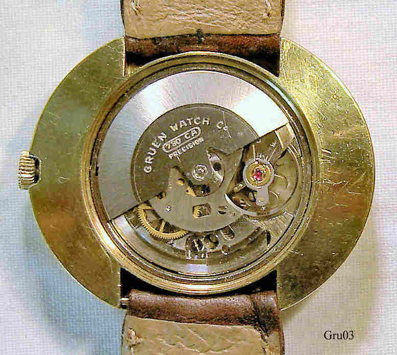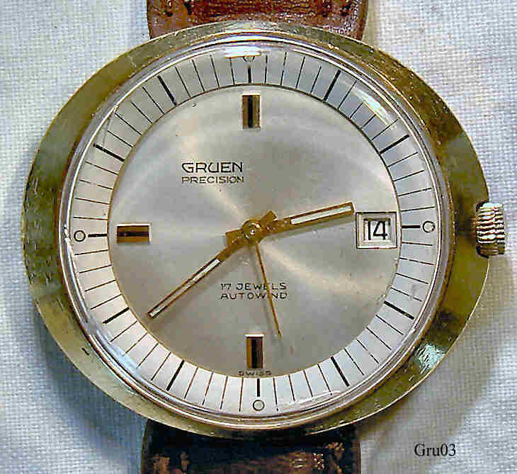 Eine schöne Gruen Precision Automatic Uhr. Base Metal Gehäuse in goldfarben mit braunem Lederarmband. Schweizer Werk, Kaliber 730CA, Inschrift vorn: ”Gruen, Precision, 17 Jewels, Autowind, Swiss”, hinten: ”Gruen Precision, Swiss Made, Base Metal Bezel, Stainless Steel Back”, innen: “Gruen Watch Co., 730CA, Precision”