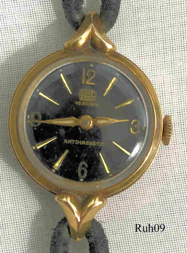 Eine Ruhla Handaufzugs Damenuhr mit vergoldetem Gehäuse und Stainless Steel Back, eine Uhr aus der Ruhla UMF Manufaktur. Beschriftung vorn: “UMF, Ruhla, 15 Rubies, Antimagnetic”, hinten: “Oberteil, Plaque 20 Micro, Boden Edelstahl”, innen: “M3, UMF ”. Uhrwerk UMF M3, schwarzes Leder Band