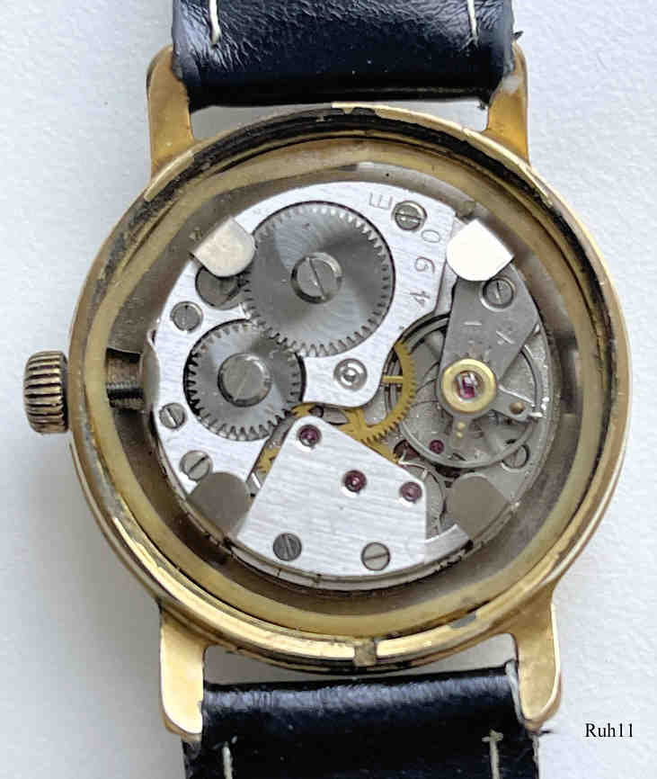 Eine Ruhla Handaufzugs Herrenuhr mit vergoldetem Gehäuse und Stainless Steel Back, eine Uhr aus der Ruhla UMF Manufaktur. Beschriftung vorn: ”€œUMF, Ruhla, 15 Rubis, Antimagnetic” hinten: ”Wassergeschützt, Plaque 20 Micron, Edelstahlboden”, innen: ”€œE490 “€. Uhrwerk UMF E490, Schwarzes Leder Band