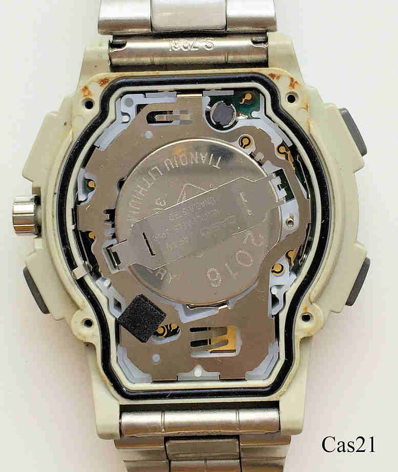 Ein moderner Ana/Digi Chronograph von Casio. Kunststoff Gehäuse mit Edelstahl Gliederarmband, schwarzes Zifferblatt, Digitalanzeige unter der 6. Beschriftet vorn: ”Casio, Illuminator,Water Resistant 100m”, innen: ”Casio, China”, hinten: ”Casio, 2315 AQ 150W, Stainless Steel Back, Water Resistant 10 Bar, Japan Mov’t Y, Cased in Thailand”.