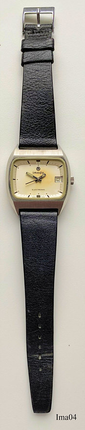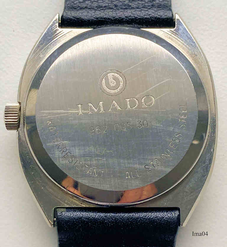 Dies ist eine Imado Stimmgabeluhr, ESA 9162, Edelstahl Gehäuse, Kalender bei der 3. Bezeichnung auf dem Zifferblatt: ”Imado, Electronic, Swiss Made”, In der Rückwand: ”Imado, All Stainless Steel, Water Resistant, 962 005 30”, innen: “Twelve 12 Jewels, Lic. Bulova & Pat. ETA Swiss”..