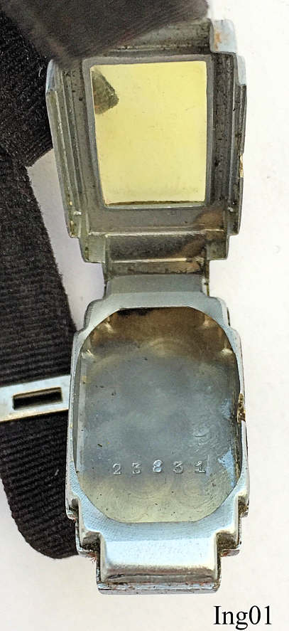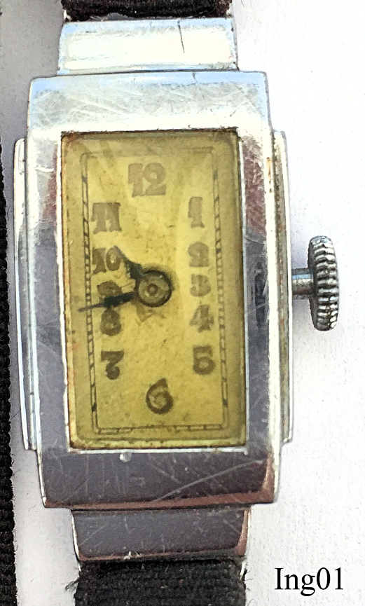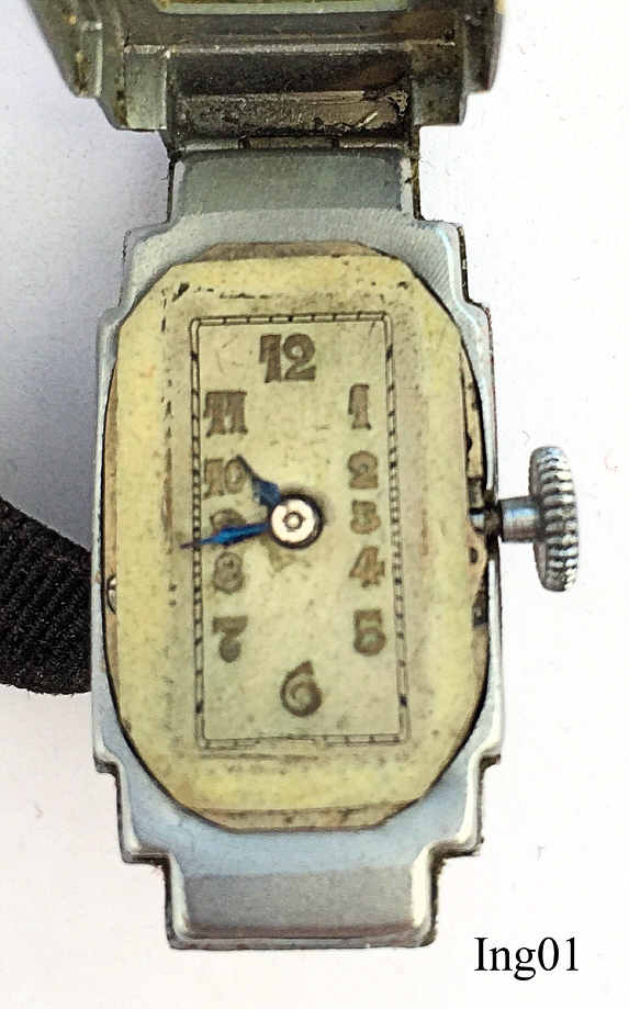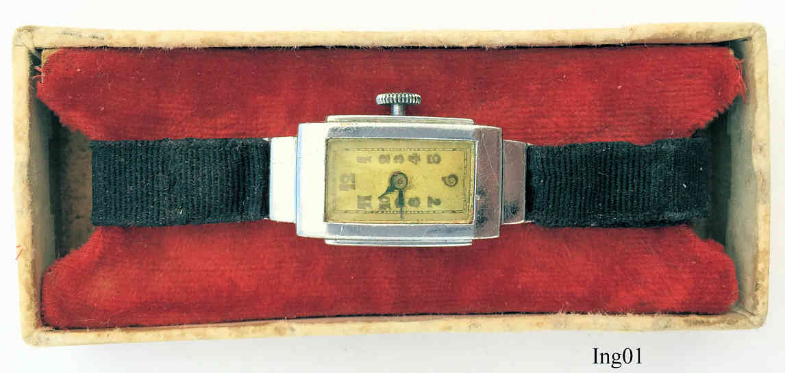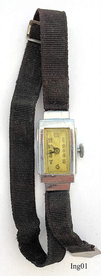 This Ingersoll ladies handwind watch is very small, app. 28x16 mm. No signature at the front, back or inside, only the serial number inside the case back: 23831. It has a textile band and is kept in the original box.