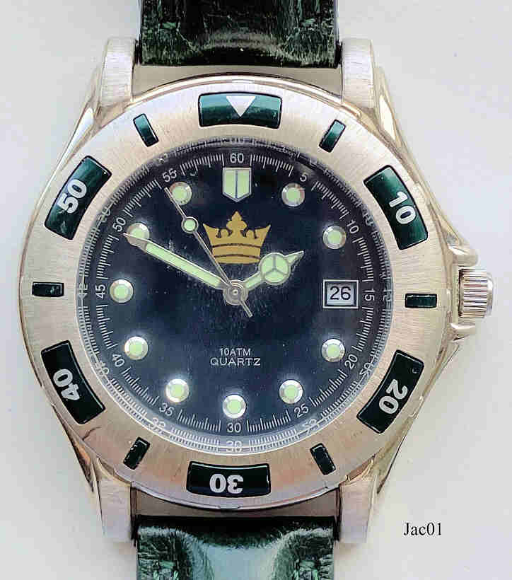 Eine Werbeuhr des Kaffeerösters Jacobs für seine Sorte Krönung. Es handelt sich um eine einfache Quartzuhr mit Datum. Beschriftet vorn: ”Wappen, 10 ATM, Quartz”, hinten: ”Hermey Hamburg, Stainless Steel Back, 10 ATM Water Resistant, Jacobs, Krönung”, innen: “Unadjusted, Miyota Co., 2115, Japan”. Grünes Lederarmband mit Krokonarbung.