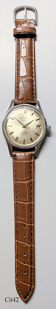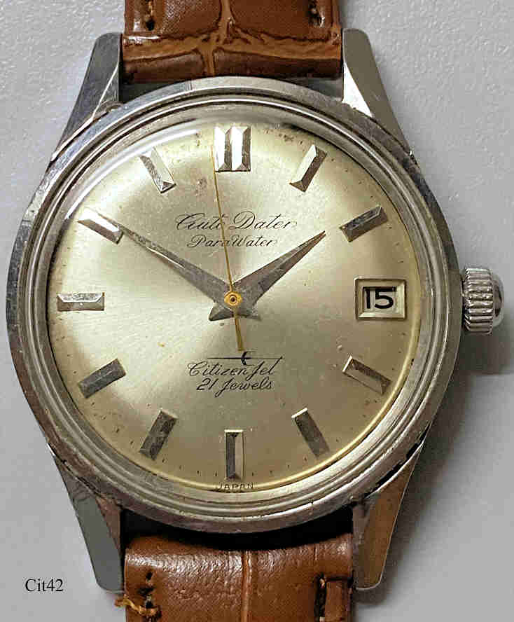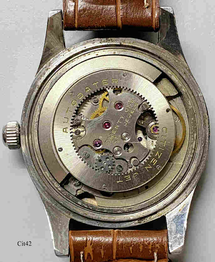Dies ist eine Citizen Auto Dater Automatic Uhr mit dem Jet Automatic Werk, Citizen Caliber 1121, Beschriftet vorn: ”Auto Dater, Para Water, Citizen Jet, 21 Jewels”, Rückseite: ”30400642”, innen: “Citizen Jet Autodater, Twentyone 21 Jewels”, Base Metal Gehäuse.