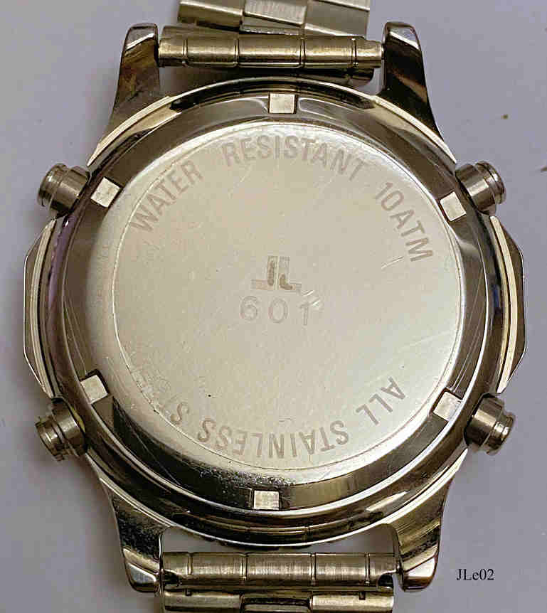 A Jacques Lemans World Timer Chronograph with white dial and stainless steel case. Functions: shows UTC and the time for 30 cities of the world, shows the calendar for 30 cities of the world, three alarms, chronograph shows 1/100 seconds, Count down timer for 60 minutes, Analog and LCD Display. Signed front: “Chronograph, 10 ATM, Jacques Lemans World Timer”, back: “All Stainless Steel, Water Resistant 10 ATM, JL 601”, inside: “Japan, Citizen Watch Co., No Jewels, C300”. Movement Citizen C300, as in Citizen Navyhawk