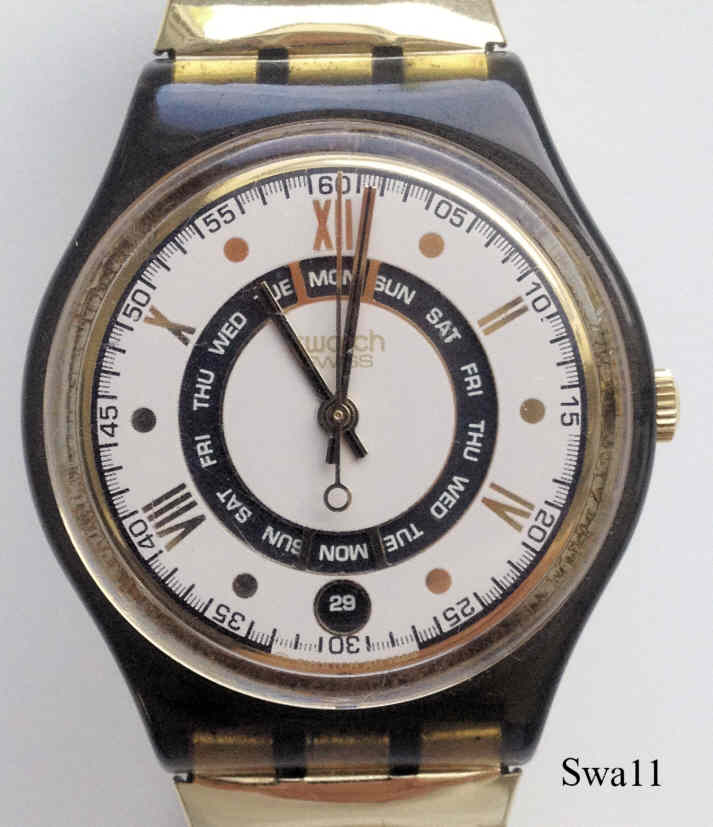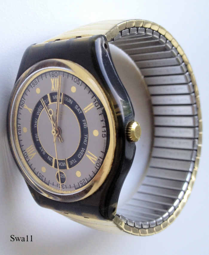Eine Swatch Quartz Uhr mit Kunststoff Gehäuse und durchscheinender Rückwand, Datum bei der 6, Tag bei der 12. Beschriftet vorn: “Swatch, Swiss”, hinten: ”Patented Water Resistant, Swiss Made, 5742, Battery, 11,60x3,10, 1,55 V”. Goldfarbenes Flex Armband.