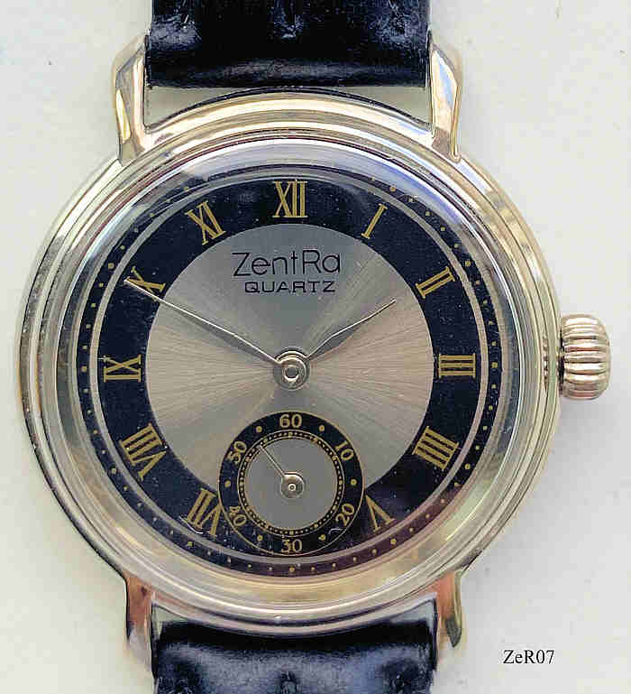 A ZentRa watch with Miyota quartz movement. Stainless Steel case with Onion crown and black leather band. Case Nr.: 022096. Signed front: “ZentRa, Quartz”, back: “022096, 9“, inside: “6L45, Miyota Co.”