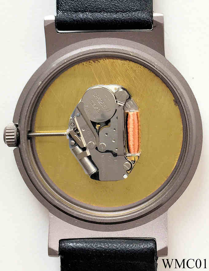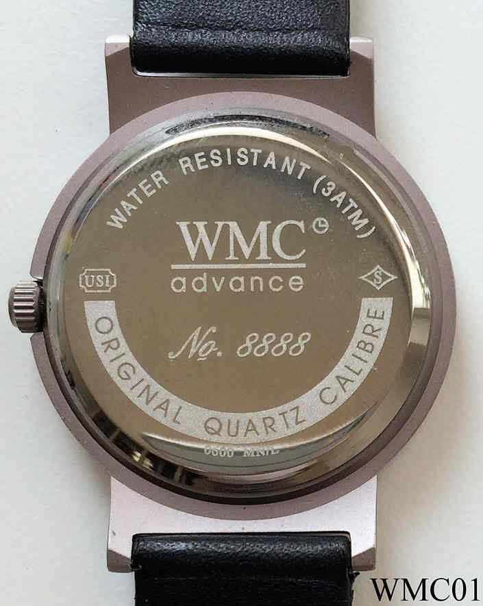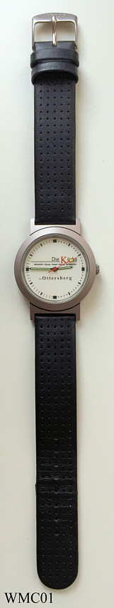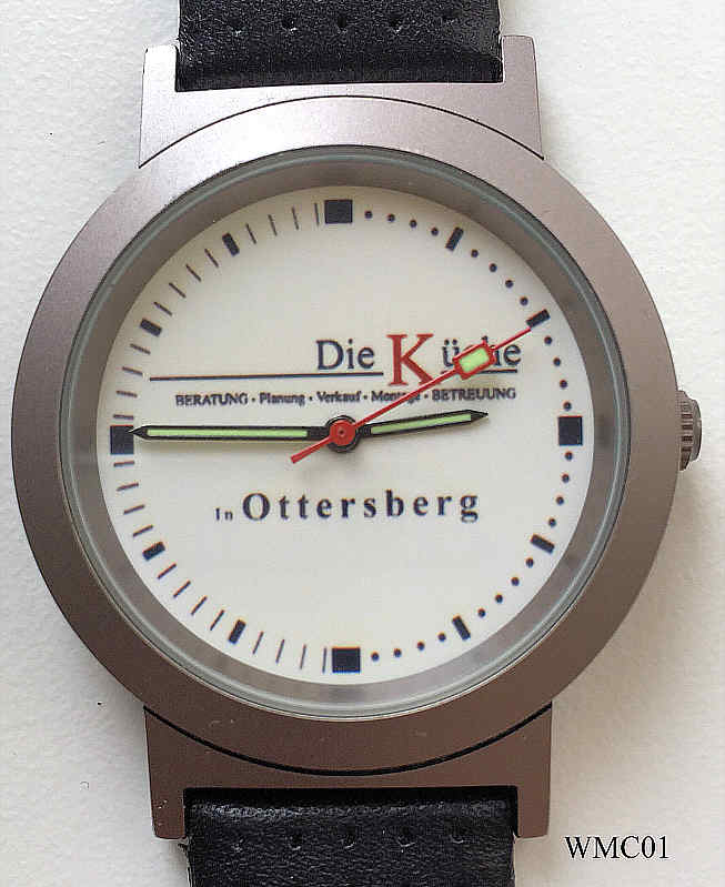 Eine Werbeuhr der Firma “Die Küche” in Ottersberg. Inschrift vorn: “Die Küche, in Ottersberg, Beratung, Planung, Verkauf, Montage, Betreuung”, hinten: “Water Resistant (3 ATM), WMC Advance, No. 8888, Original Quartz Calibre, 0600 MN/L”, innen: “No 0 Jewels, Unadjusted, Miyota Co., Japan, 280-39” . Einfaches Miyota Uhrwerk, schwarzes Lederband