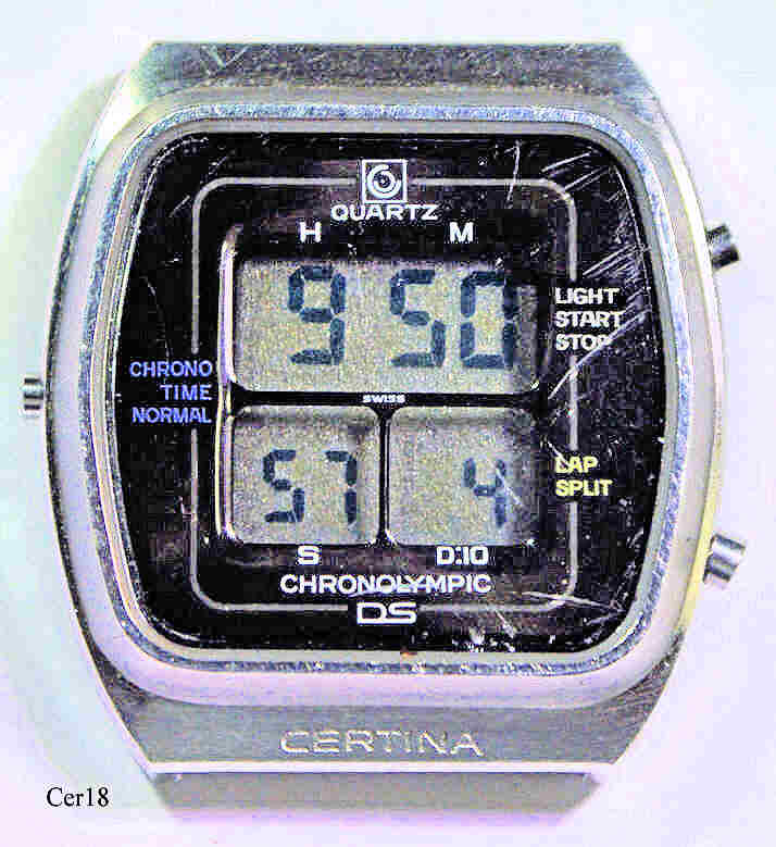 Dies ist eine Certina Chronolympic, eine Digitaluhr mit LCD Display. Beschriftung vorn: ”Quartz, Chronolympic, DS”, hinten: “Certina DS, Super Waterproof, Super Shockproof, 787 142041”, innen: “Unadjusted, No (0) Jewels, Swiss Made, 934 712”, Edelstahl Gehäuse.