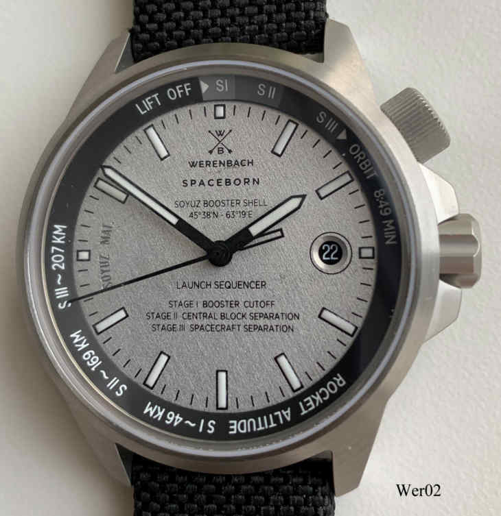 This is a Werenbach Automatic watch, Series Leonov Model SN M2 059 2018. The complete dial consists of Aluminum from a Booster of the Sojus Rocket that started on the 06.06.2018 with “Astro Alex” Alexander Gerst, Sergey Prokopyev and Serena M. Aunón-Chancellor to the ISS. The Material reached an altitude of 46 Km before it was ejected. The upper crown turns the Launch Sequencer Ring, where some Phases of the Flight are marked. ront: “Werenbach, Spaceborn, Soyuz Booster Shell, 45°38` N, 63°19’E, Launch Sequencer, Stage I Booster Cutoff, Stage II Central Block Separation, Stage III Spacecraft Separation, Soyuz Mat.”, backn: “Manned Space Mission to ISS, Soyuz Ms-09, 3 ATM, M2 059 2018”. Movement Caliber STP 1-11. The square metal parts are front and back of the original rocket piece of material from which the dial has been manufactured. |