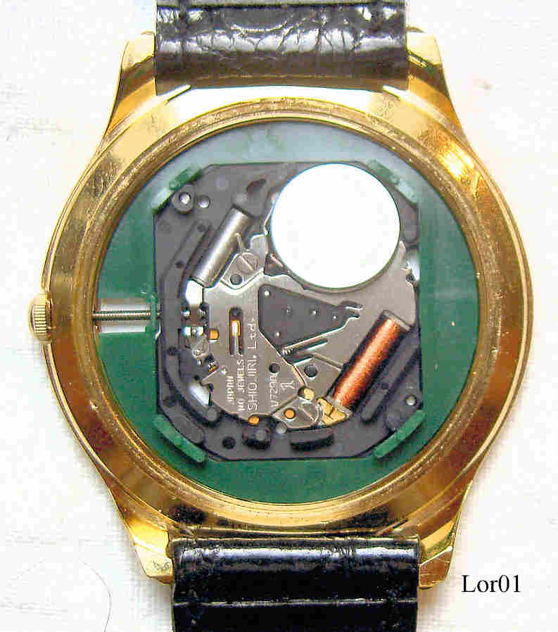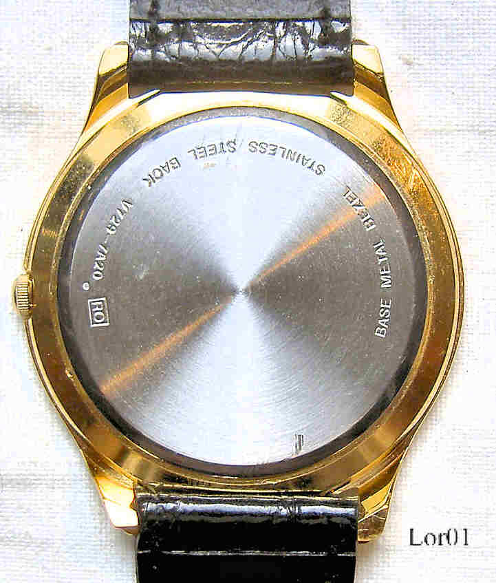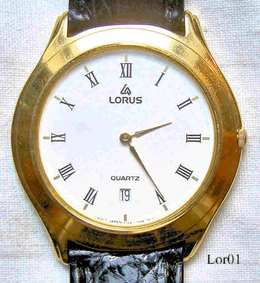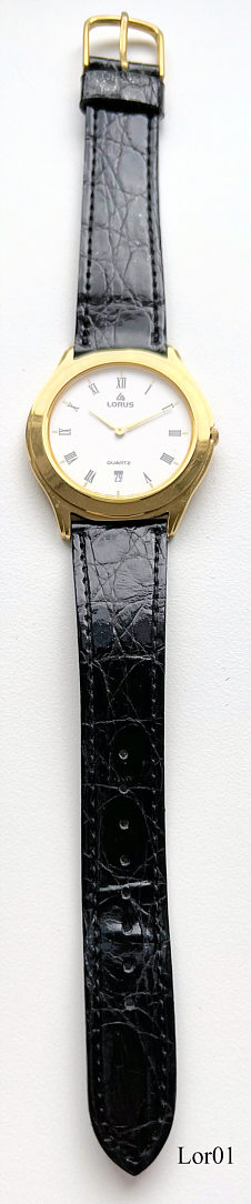 Dies ist eine Lorus Quartz Uhr mit römischen Ziffern und Kalender bei der 6. Beschriftung vorn: ”LORUS, JAPAN V 729-7A20 BO”, hinten: ”Base Metal Bezel, Water resistant, Stainless Steel Back, V 729-7A20 BO“, innen: “Japan, No Jewels, Shiojiri Ltd., V729A”. Base Metal Gehäuse mit Edelstahl Boden und schwarzem Lederarmband.