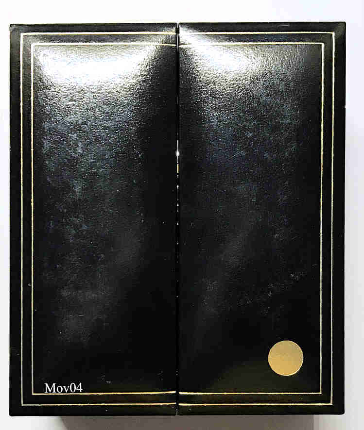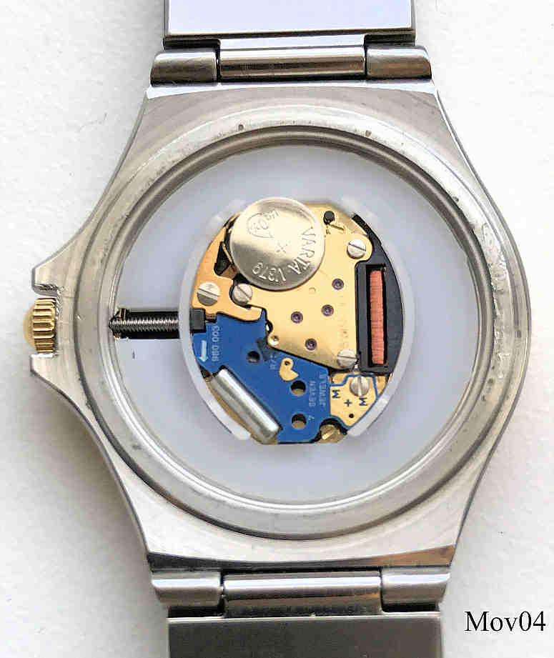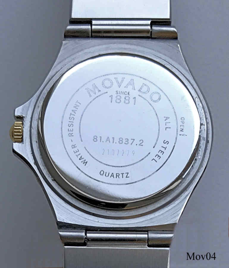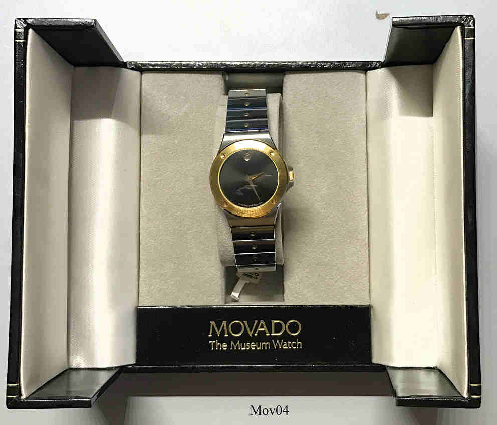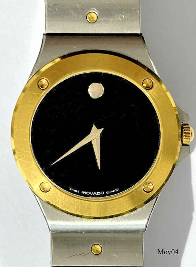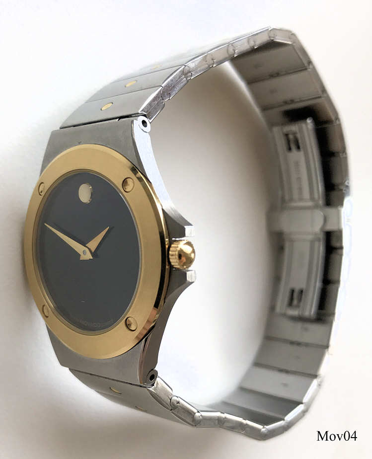 Das klassische Desig der Movado Museumsuhr wurde 1947 vom Americanischen Künstler Nathan George Horwitt entwickelt. Das Motto war: Ein schwarzes Zifferblatt mit einem solitären goldenen Punkt bei der 12, der die Sonne am Mittag symbolisiert. Die Zeiger stehen für die Bewegung der Erde. Goldener Kranz um das Zifferblatt. Beschriftet vorn: “Swiss Movado Quartz”, hinten: “Movado since 1881, All Steel, Quartz, Water Resistant, 86-A1-837.2, 2107279”, innen: “ ETA 980.003, 7 Jewels, Movado, Swiss, V8 “, Edelstahl Gliederarmband mit vergoldeten Punkten.