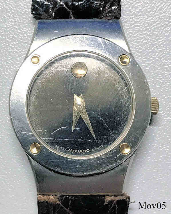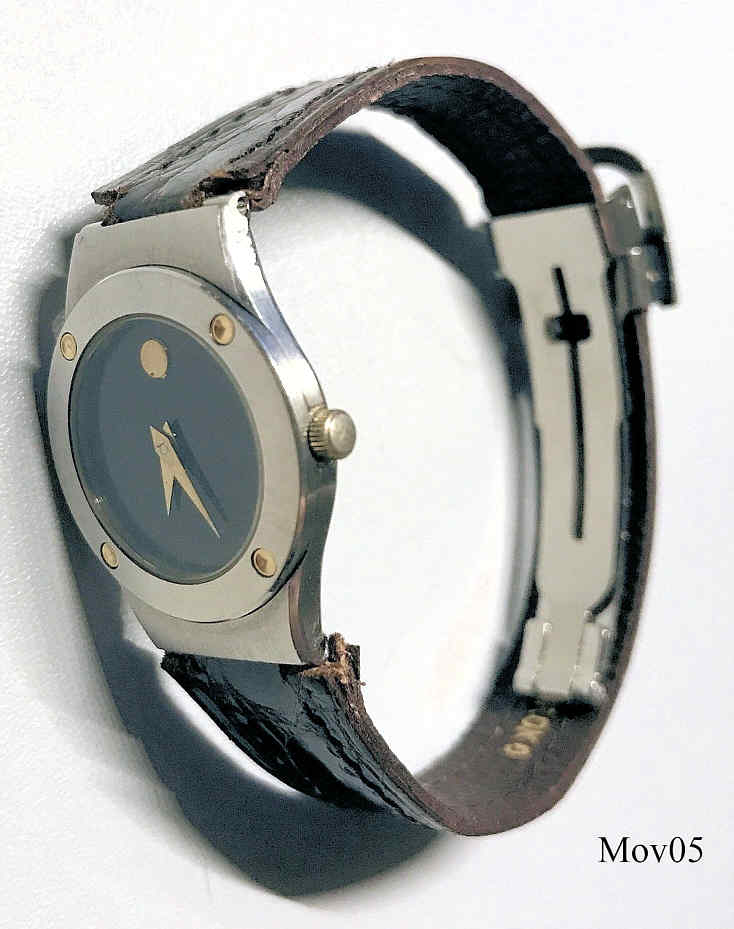 Das klassische Desig der Movado Museumsuhr wurde 1947 vom Americanischen Künstler Nathan George Horwitt entwickelt. Das Motto war: Ein schwarzes Zifferblatt mit einem solitären goldenen Punkt bei der 12, der die Sonne am Mittag symbolisiert. Die Zeiger stehen für die Bewegung der Erde. damenuhr mit silberner Kranz um das Zifferblatt und 4 eingesetzten goldenen Punkten. Beschriftet vorn: “Swiss Movado Quartz”, hinten: “ 86-A1-836 K, 947656”, innen: “ ETA 980.003, 7 Jewels, Movado, Swiss, V8 “, Braunes Lederarmband.