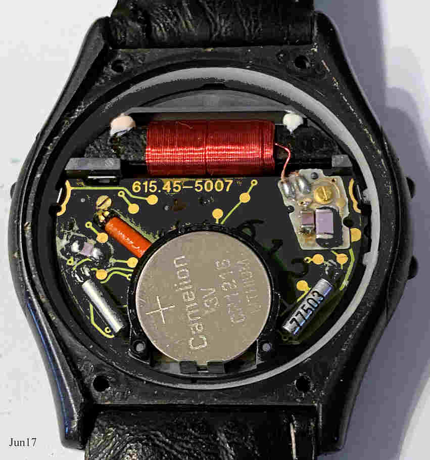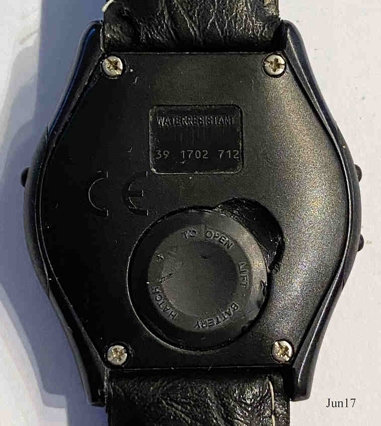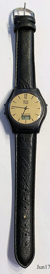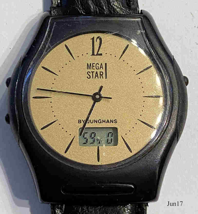 Eine Junghans Mega Star Funkuhr mit Curry farbenem Zifferblatt und schwarzen Ziffern. Schwarzes Kunststoff- Gehäuse und schwarze Kunststoff Rückwand. Beschriftet: ”Mega Star, by Junghans”, hinten: “CE, Water Resistant, 39 1702 712”, innen: “615.45-5007”, Sekunden oder Datum Display bei der “6”