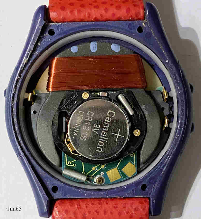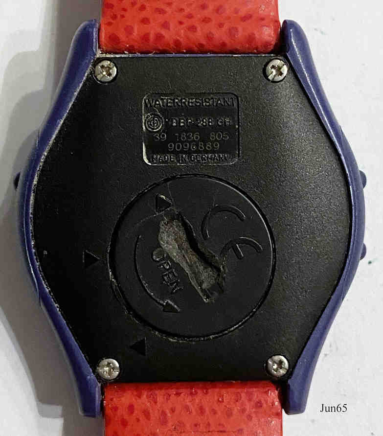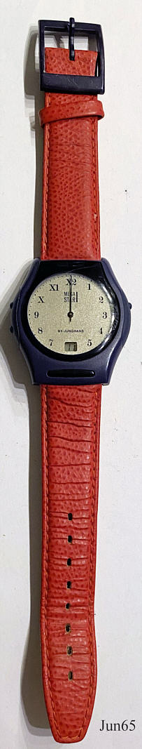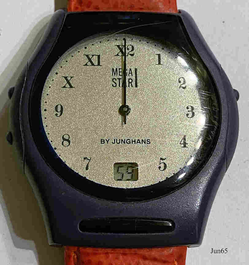 Eine Junghans Mega Star Funkuhr mit Silber farbenem Zifferblatt und schwarzen, eigenwilligen (X2?) römischen Ziffern. Blaues Kunststoff- Gehäuse und schwarze Kunststoff Rückwand. Beschriftet: ”Mega Star, by Junghans” hinten: “CE, Water Resistant, 39 1836 805, 9096889, Made in Germany”, innen: “W606, Junghans”, Sekunden oder Datum Display bei der “6”
