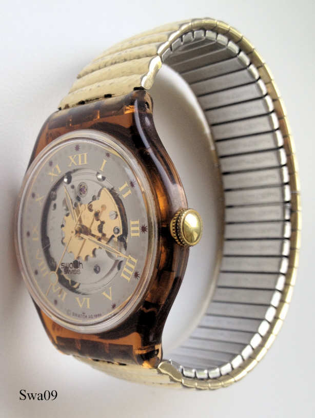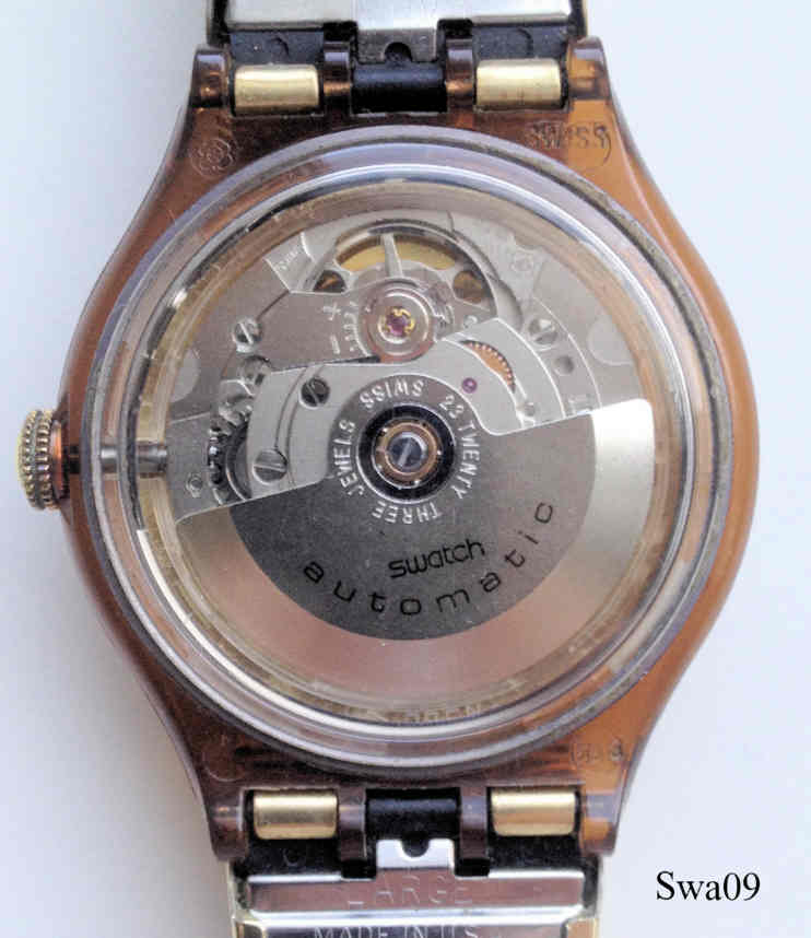 Eine Swatch Automatic Uhr, Modell “Nugget”, mit Kunststoff Gehäuse und transparenter Rückwand. Beschriftet vorn: “Swatch, Swiss, Swatch AG 1995”, hinten: ”2840, Swatch, Automatic, 23 Twenty Three Jewels, Swiss”. Goldfarbenes Flex Armband. 1996 SAF100