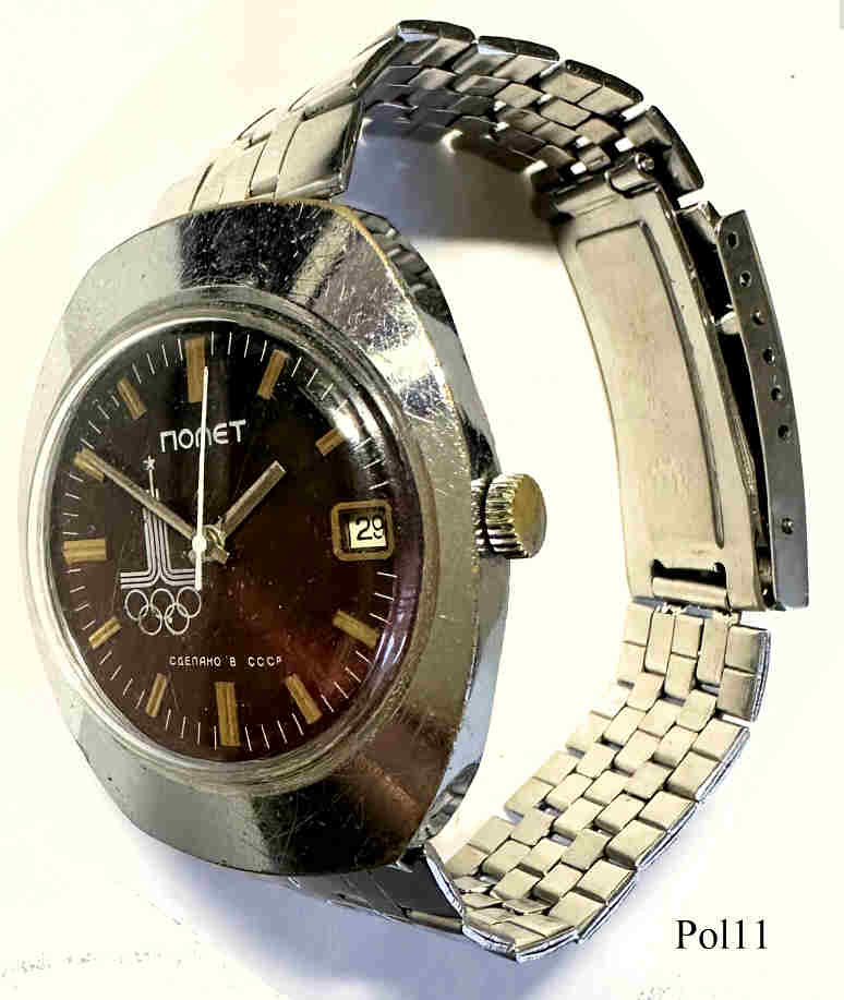 Eine Poljot Handaufzugsuhr als Erinnerung an die Olympiade 1980 in Moskau. Kalender bei der 3. Beschriftung: ”Poljot, CCCP”, Rückseite: ” ”, Kaliber Poljot 2614.2H, Edelstahl Gliederarmband