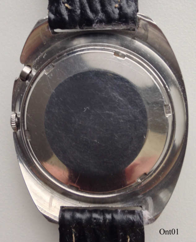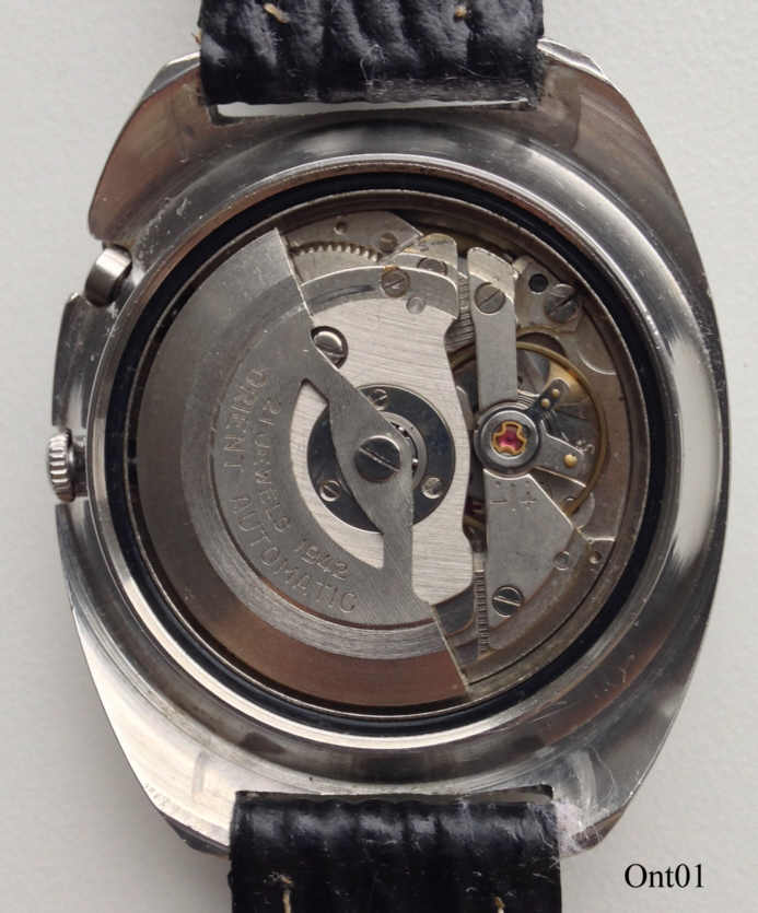 This Orient Weekly Automatic watch has been designed for the far east area. Date at 3 with a lens in the glasand month at 6.Signed front: “Weekly Auto Orient, A.A.A, Waterproof, 21 Jewels”, back: “40M Waterproof, Stainless Steel, Antishock, H114957, Weekly Auto Orient”, on the swing: “21 Jewels, 1942, Orient Automatic”, black leather band.