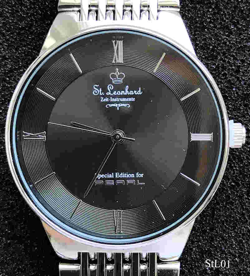 Eine Werbeuhr der Firma Pearl mit ungewöhnlicher Armbandbefestigung. Schwarzes Zifferblatt mit dunklen Zeigern. Beschriftet vorn: “St. Leonhard, Zeit-Instrumente, Special Edition for, Pearl”, hinten: ”Stainless Steel Caseback, Water Resistant 3 ATM, PEARL”, innen: “No Jewels, Unadjusted”, Integriertes Edelstahlarmband. Werbegeschenk der Firma Pearl, eine Uhr der Marke St. Leonhard.