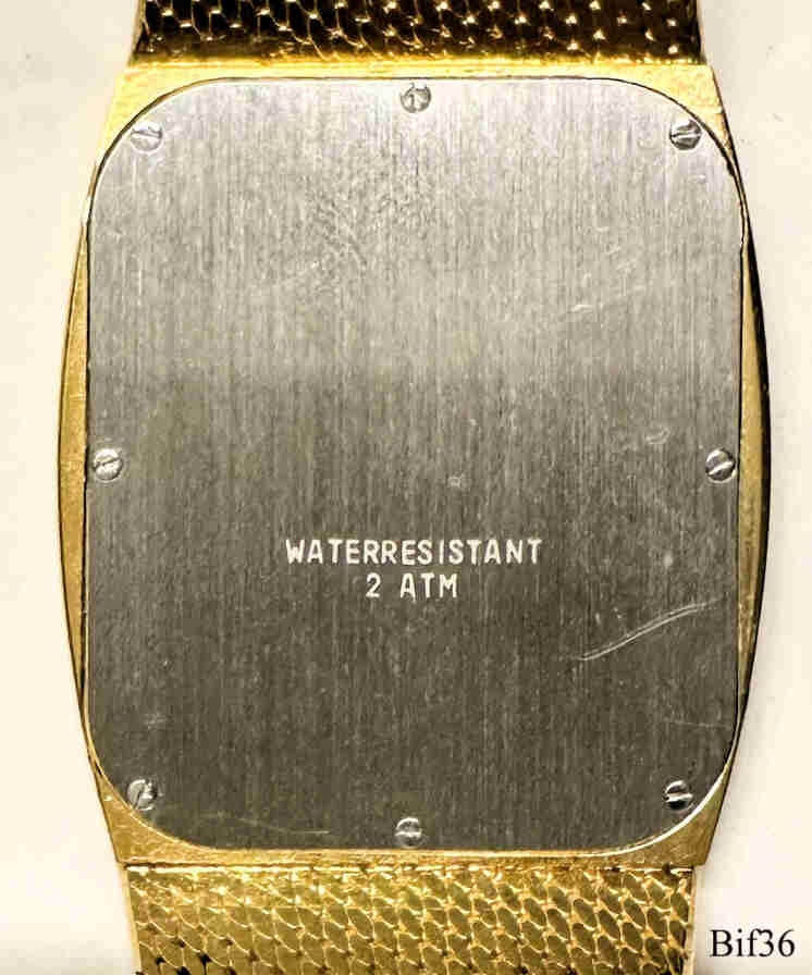 This is a Bifora quartz watch, using the slim-line movement B18 of Bifora. At the market placement it was the slimmest watch in the world with 3,0mm..  This B18 movement is a separate one, the alignment is at the side. The watch has a very attractive golden case. Signed front: ” BIFORA, Quartz” back:”Two Jewels, Unadjusted, W. Germany, B”, Caliber: Bifora B18”, blue leather band.