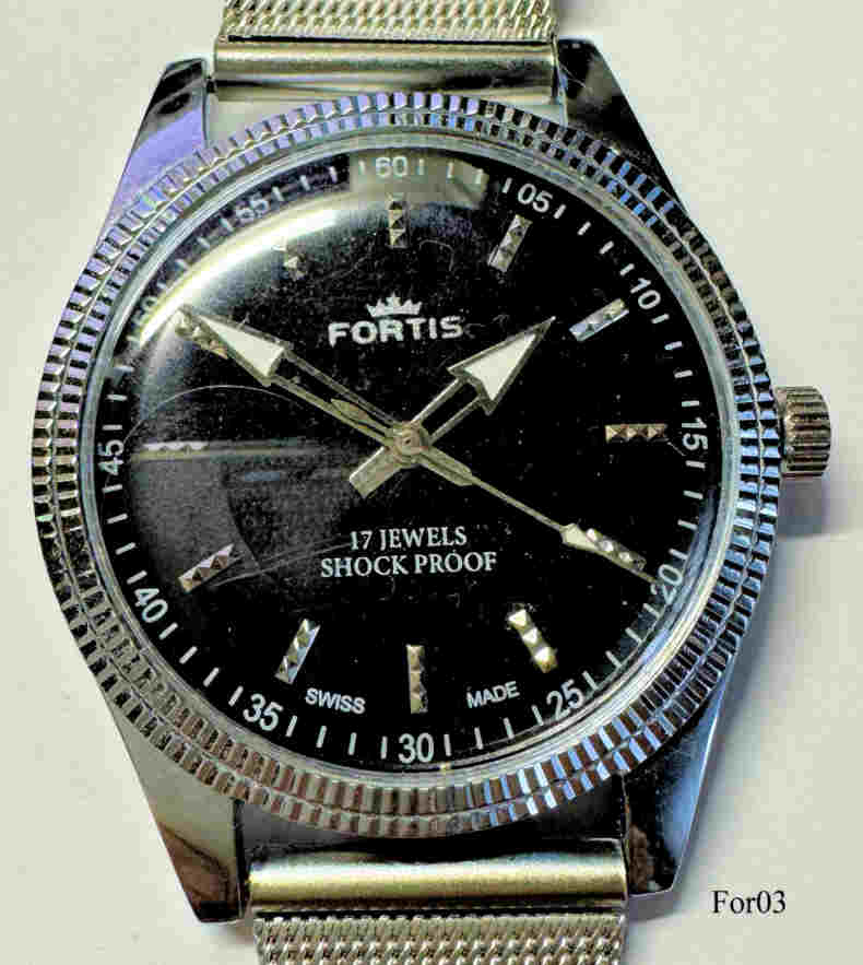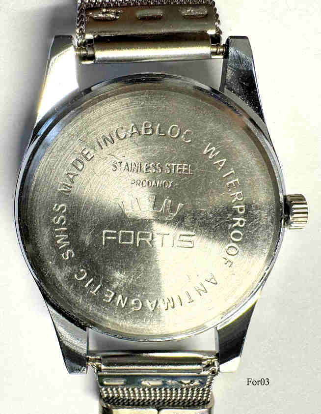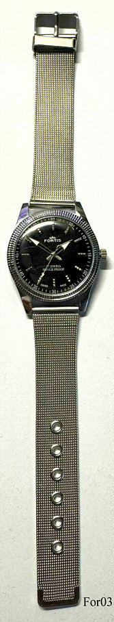 A handwind watch from Fortis with black dial, model Prodanox. Signed front: ”Fortis, 17 Jewels, Shockproof”, back: “Stainless Steel, Prodanox, FORTIS,Swiss Made, Incablock, Waterproof, Antimagnetic”, inside: ”FHF969N, ST, Swiss, Seventeen 17 Jewels”. Caliber FHF ST 969N, Milanaise Band